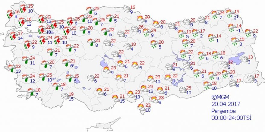 Ülke genelinin parçalı ve çok bulutlu, Marmara, Ege, Batı Akdeniz, İç Anadolu'nun kuzeybatısı, Batı Karadeniz, Doğu Karadeniz'in iç kesimleri, Doğu Anadolu'nun kuzeyi, Güneydoğu Anadolu'nun doğusu ile Sivas, Tokat, Bingöl ve Muş çevrelerinin sağanak ve yer yer gök gürültülü sağanak yağışlı geçeceği tahmin ediliyor.