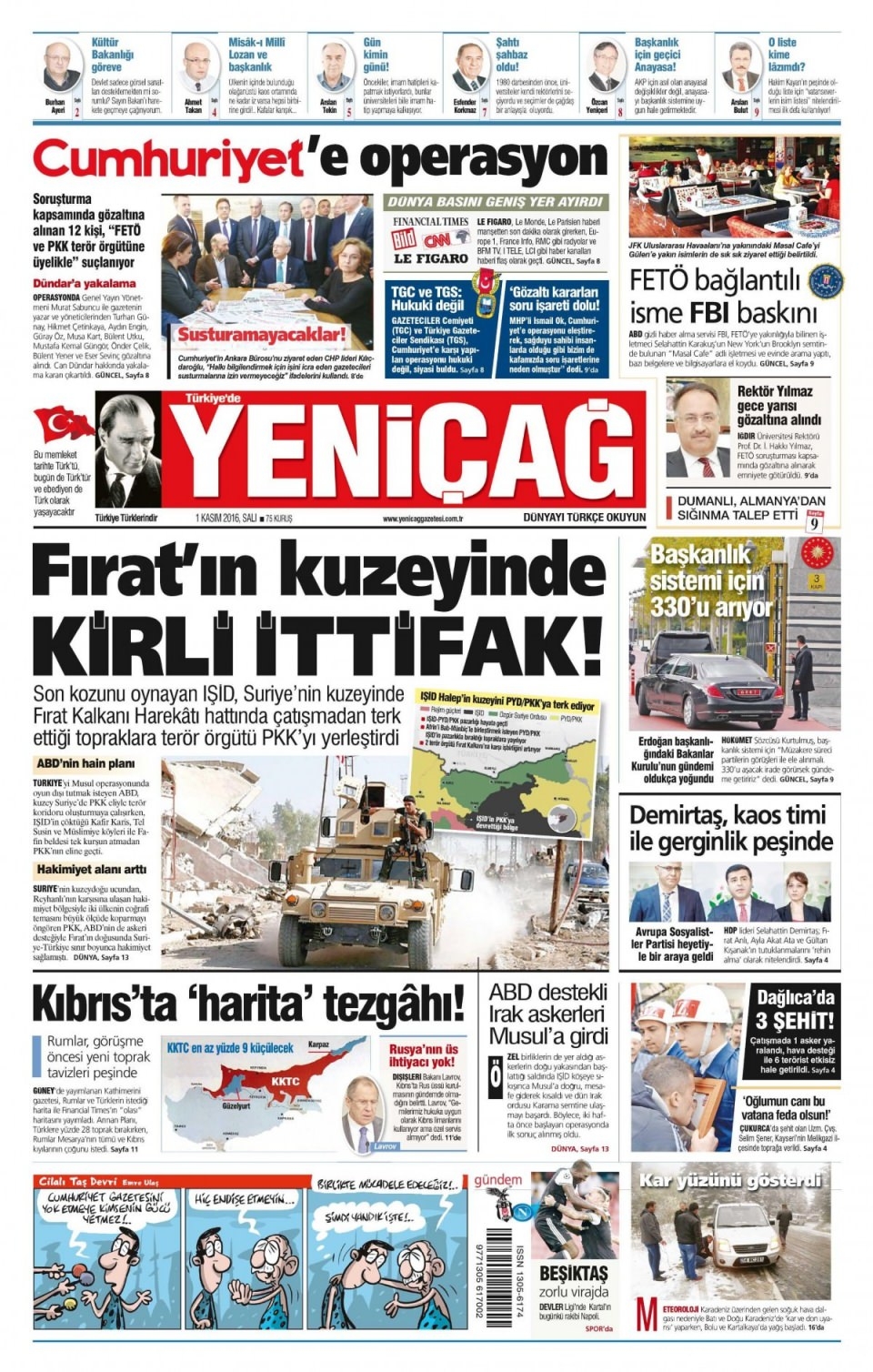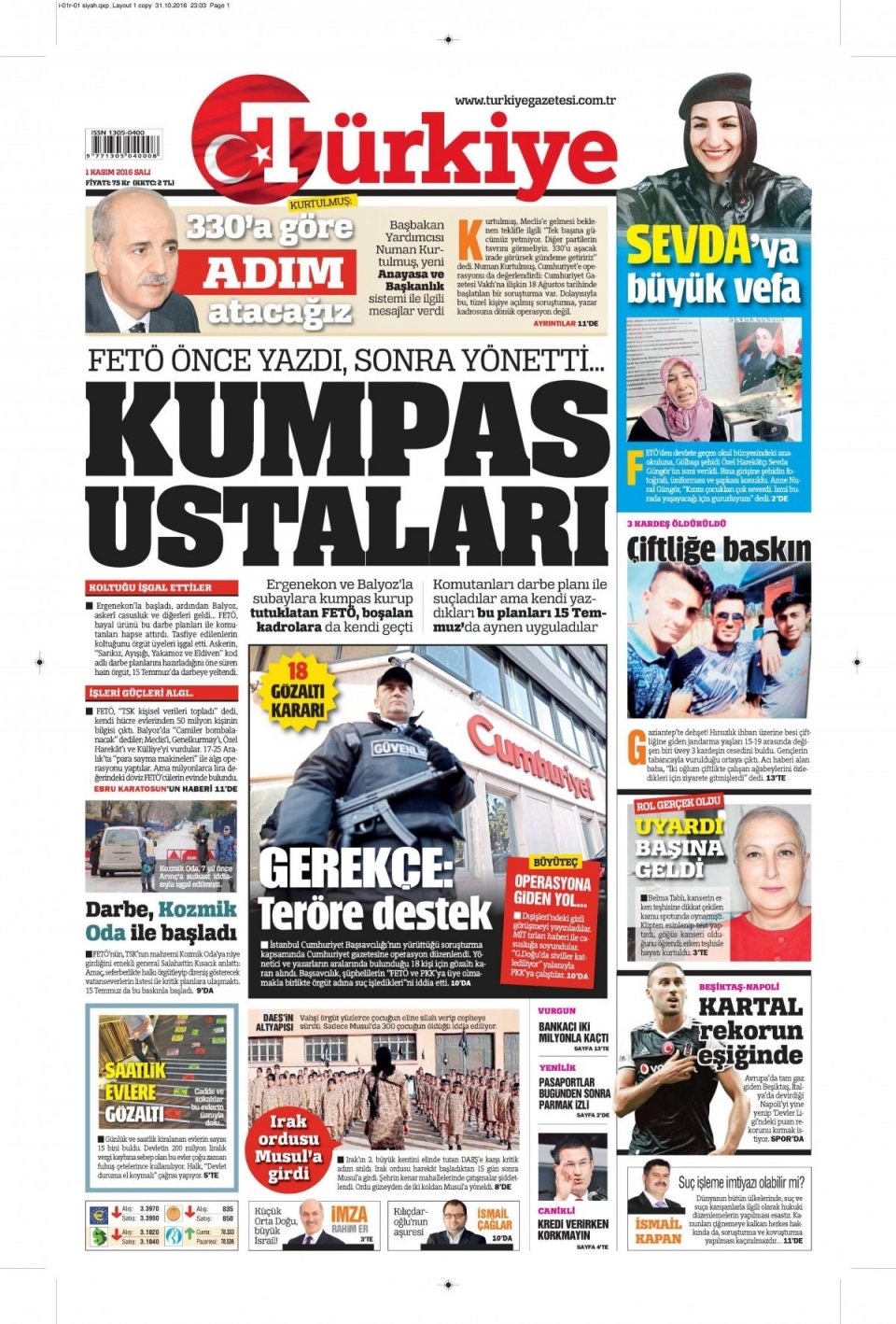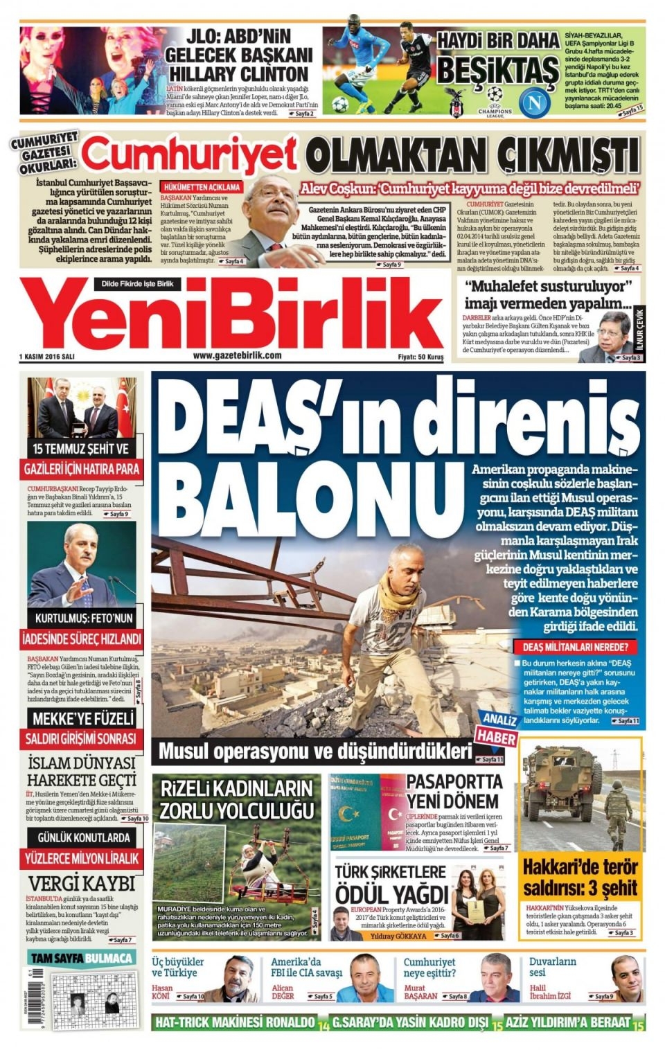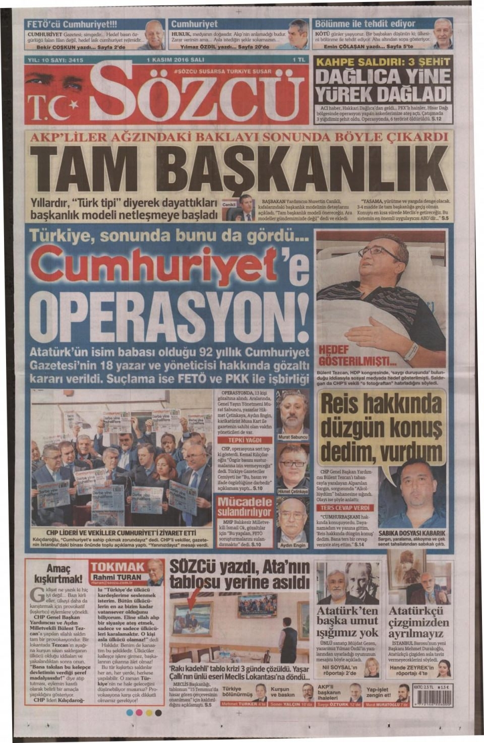 1 Kasım Salı günün gazete manşetleri