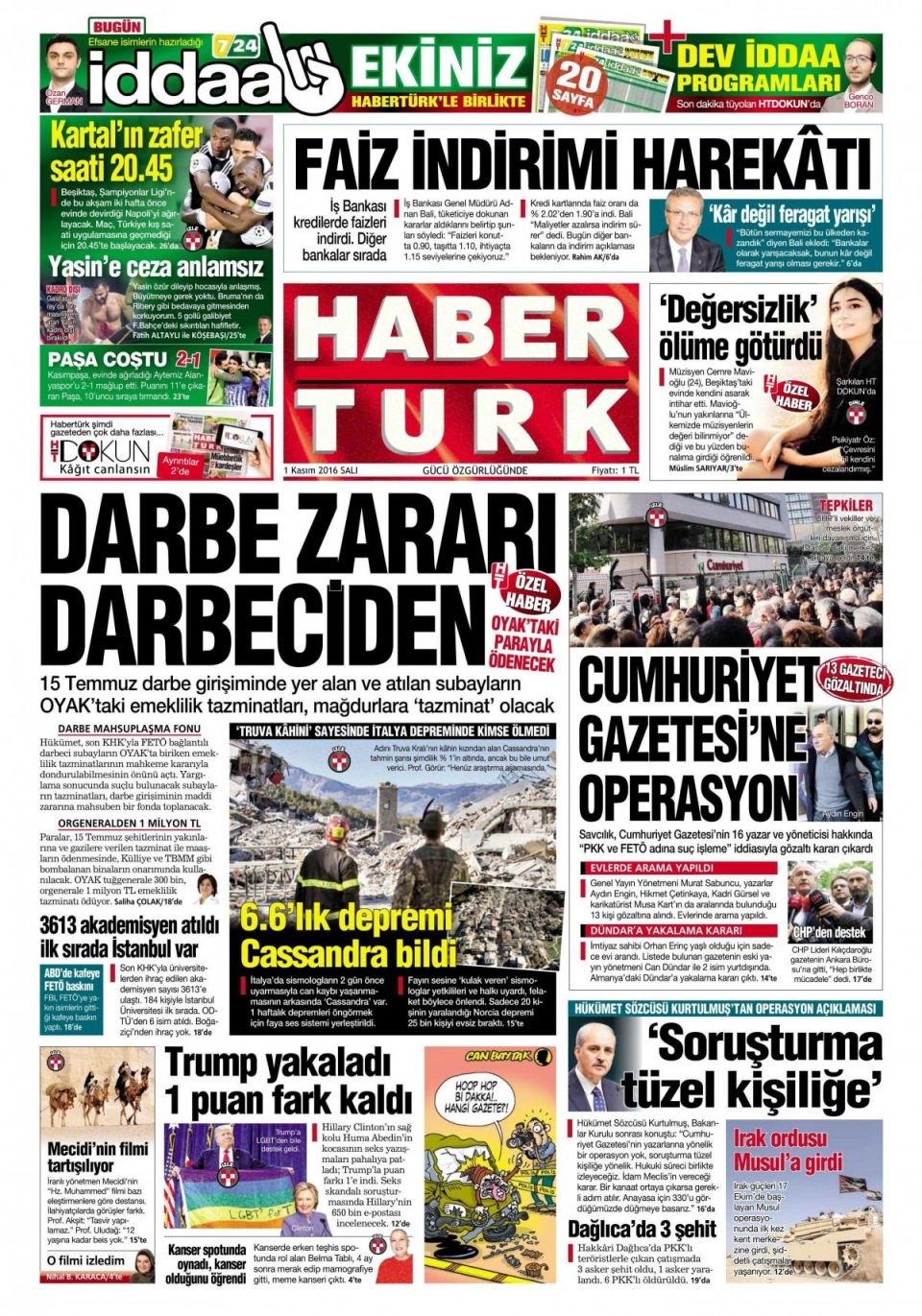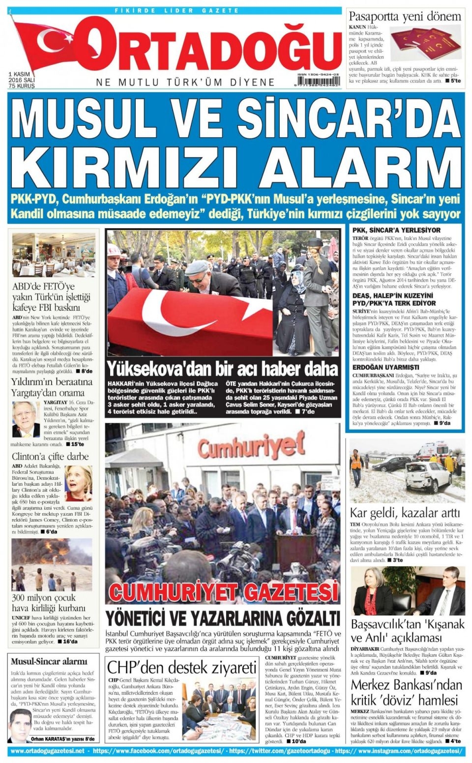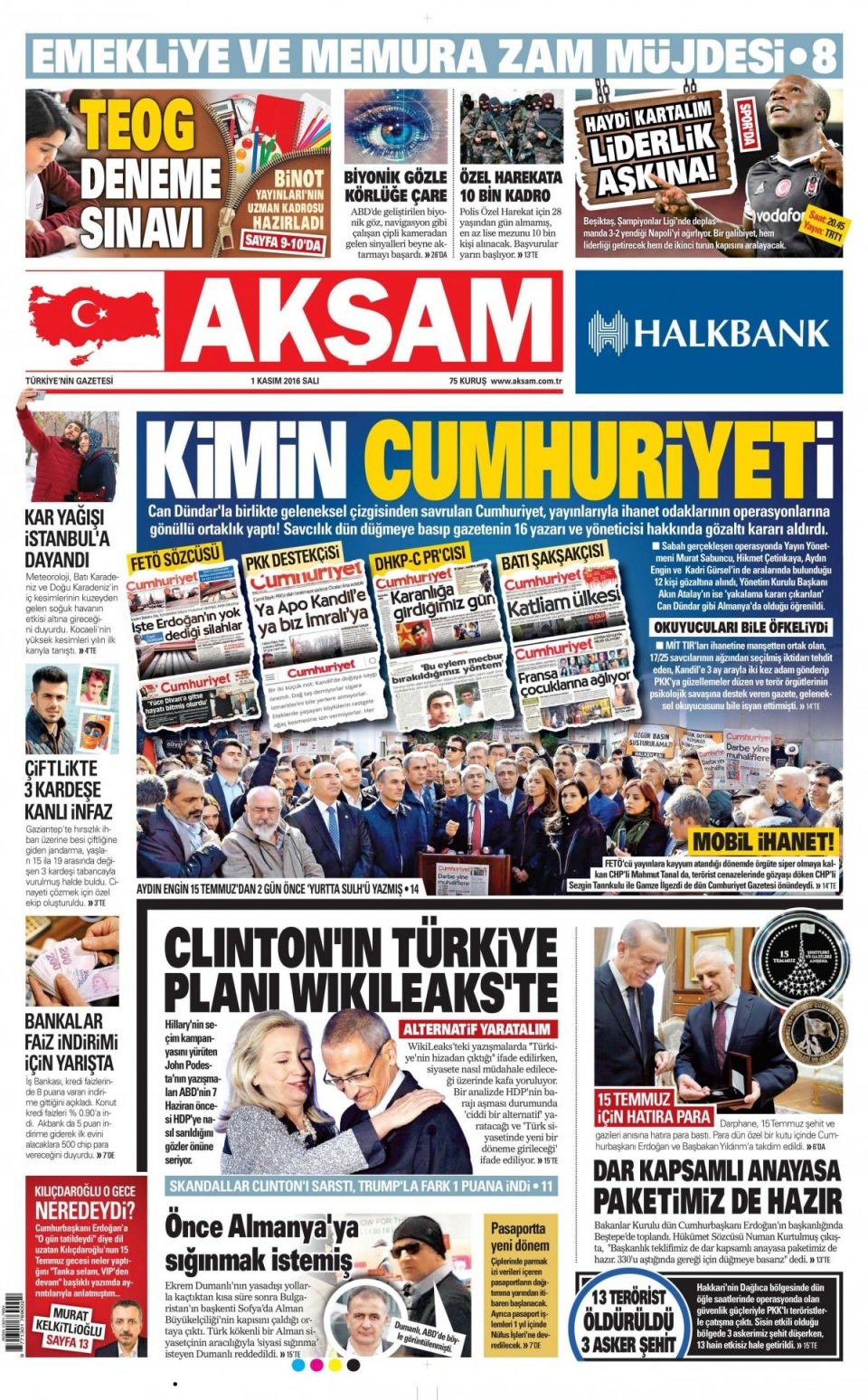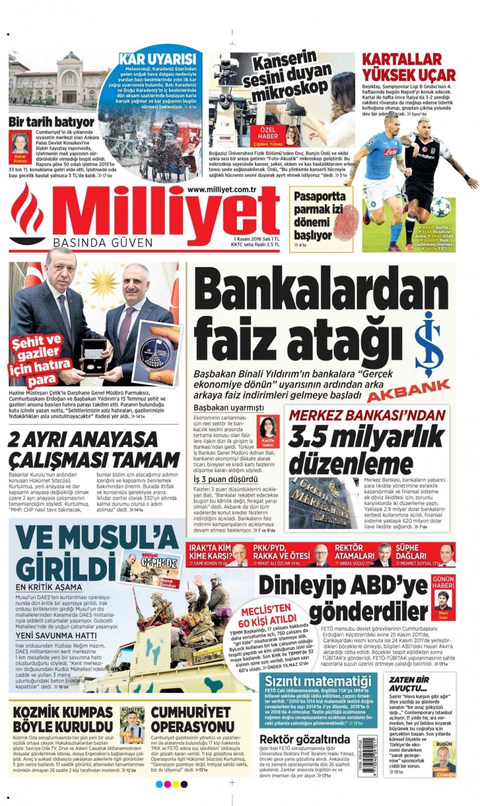 1 Kasım Salı günün gazete manşetleri