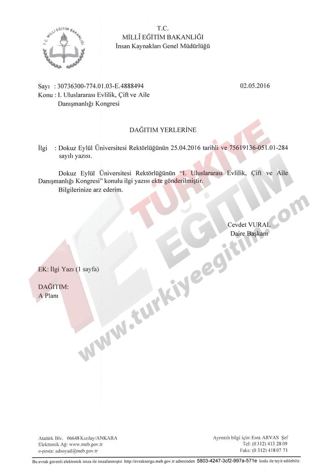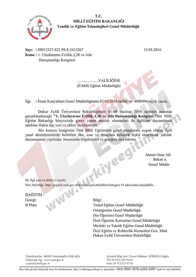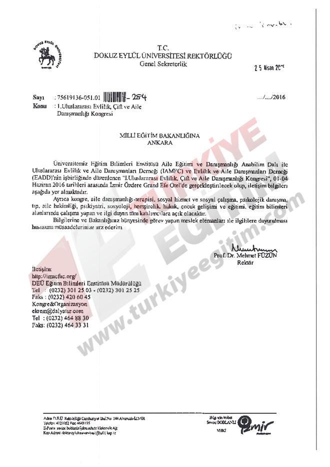 Dokuz Eylül Üniversitesi Rektörlüğünün 01-04 Haziran 2016 tarihleri arasında gerçekleştireceği "1. Uluslararası Evlilik, Çift ve Aile Danışmanlığı Kongresi "nin Milli Eğitim Bakanlığı bünyesinde görev yapan meslek elamanları ile ilgililere duyurulması talebine ilişkin ilgi yazı ve ekleri incelenmiştir.