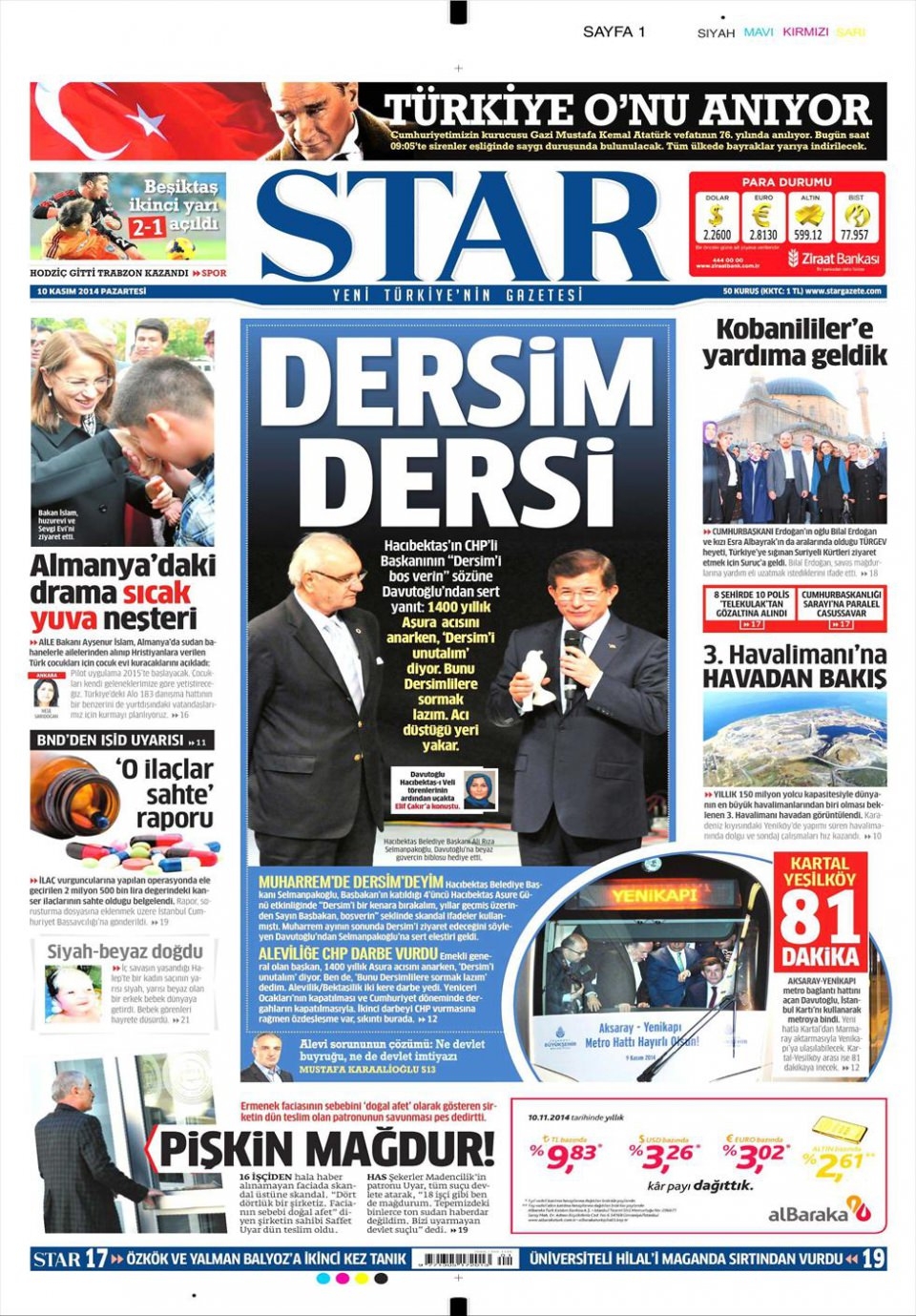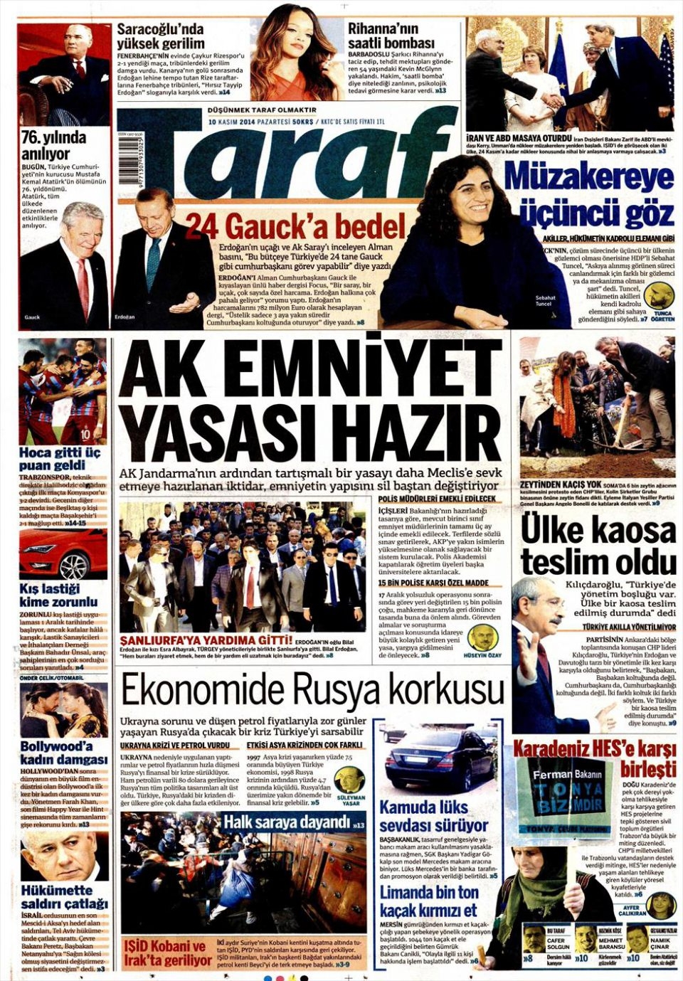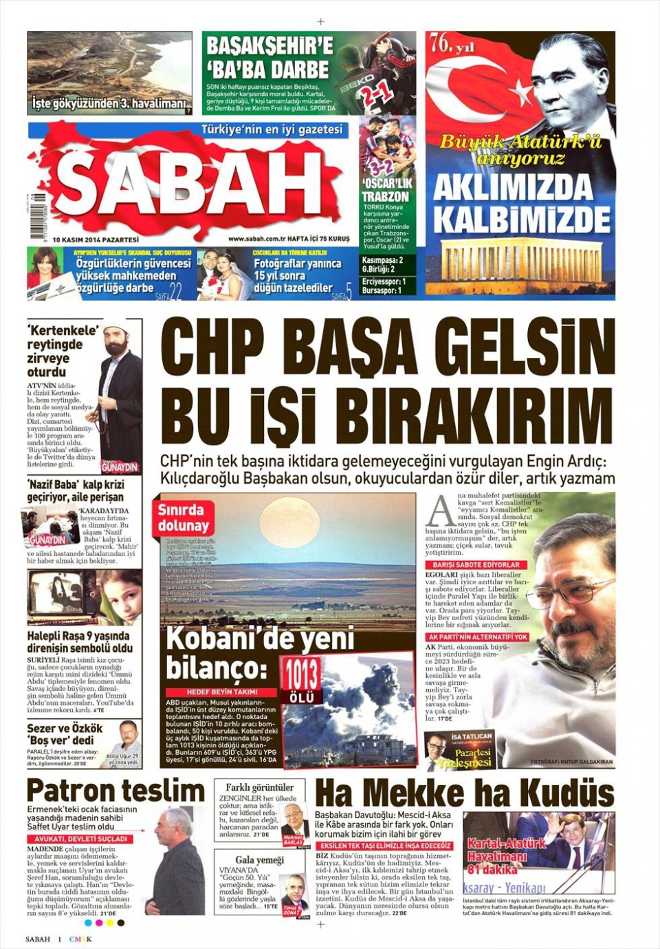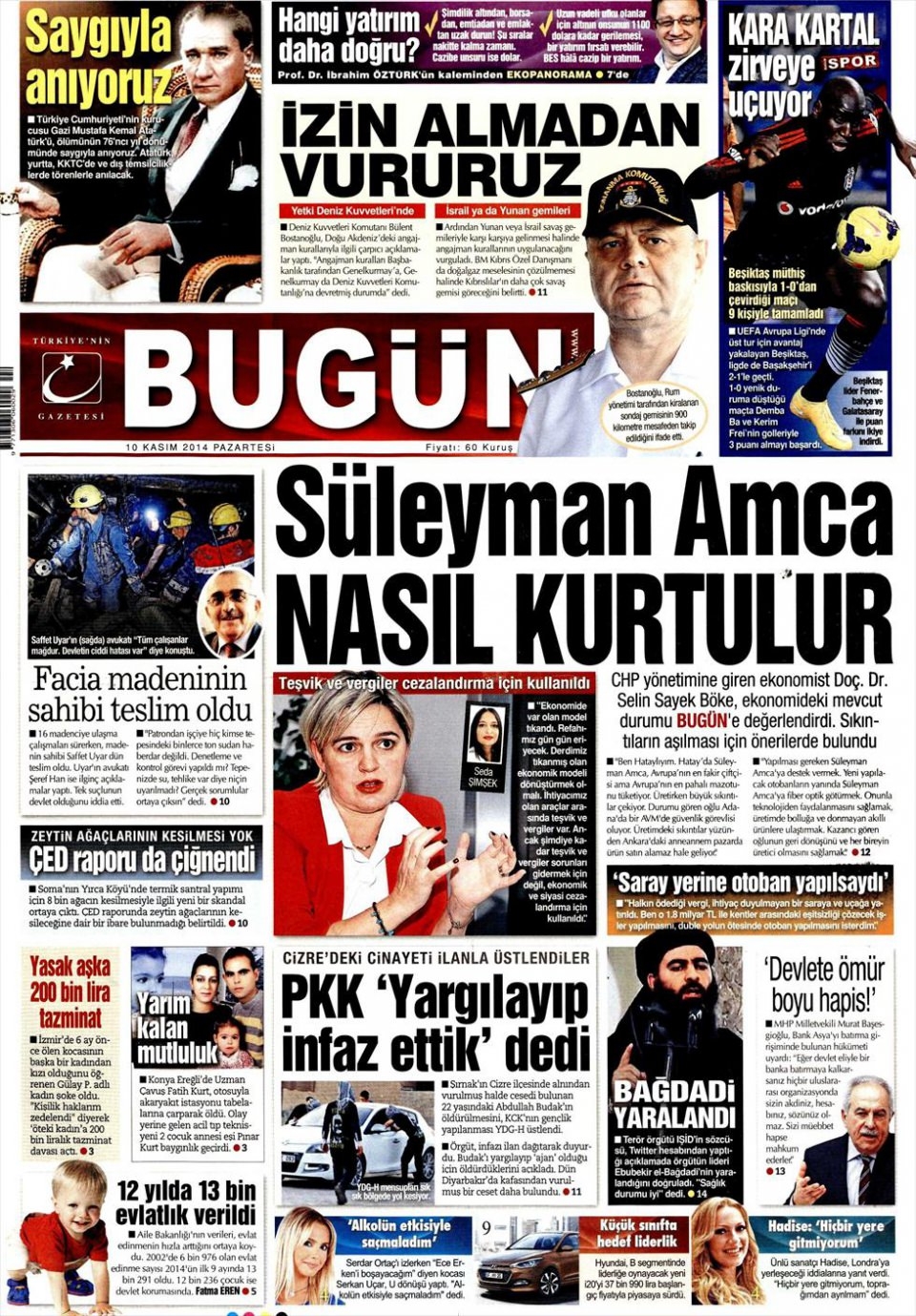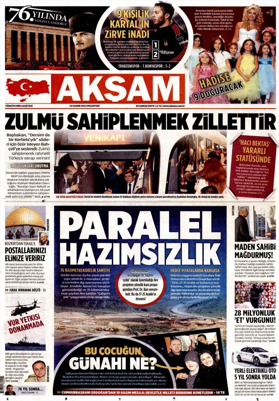 10 Kasım 2014 gazete manşetleri