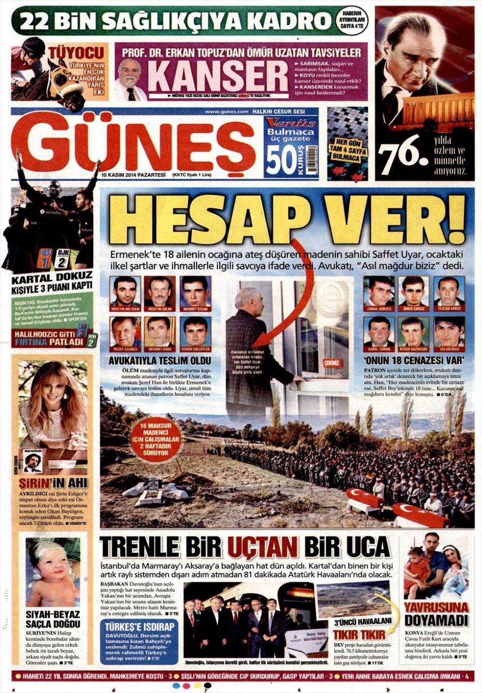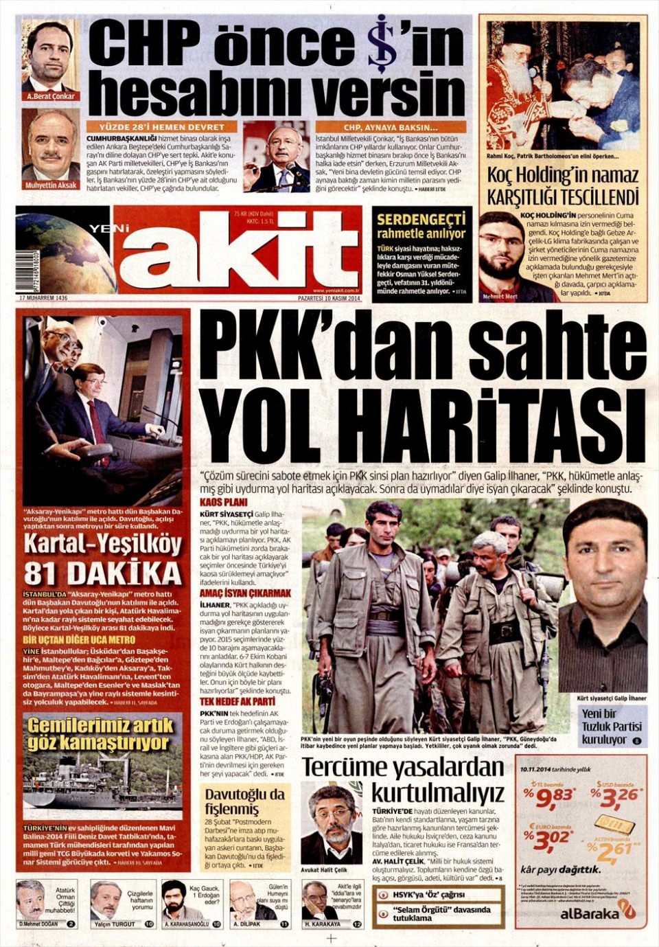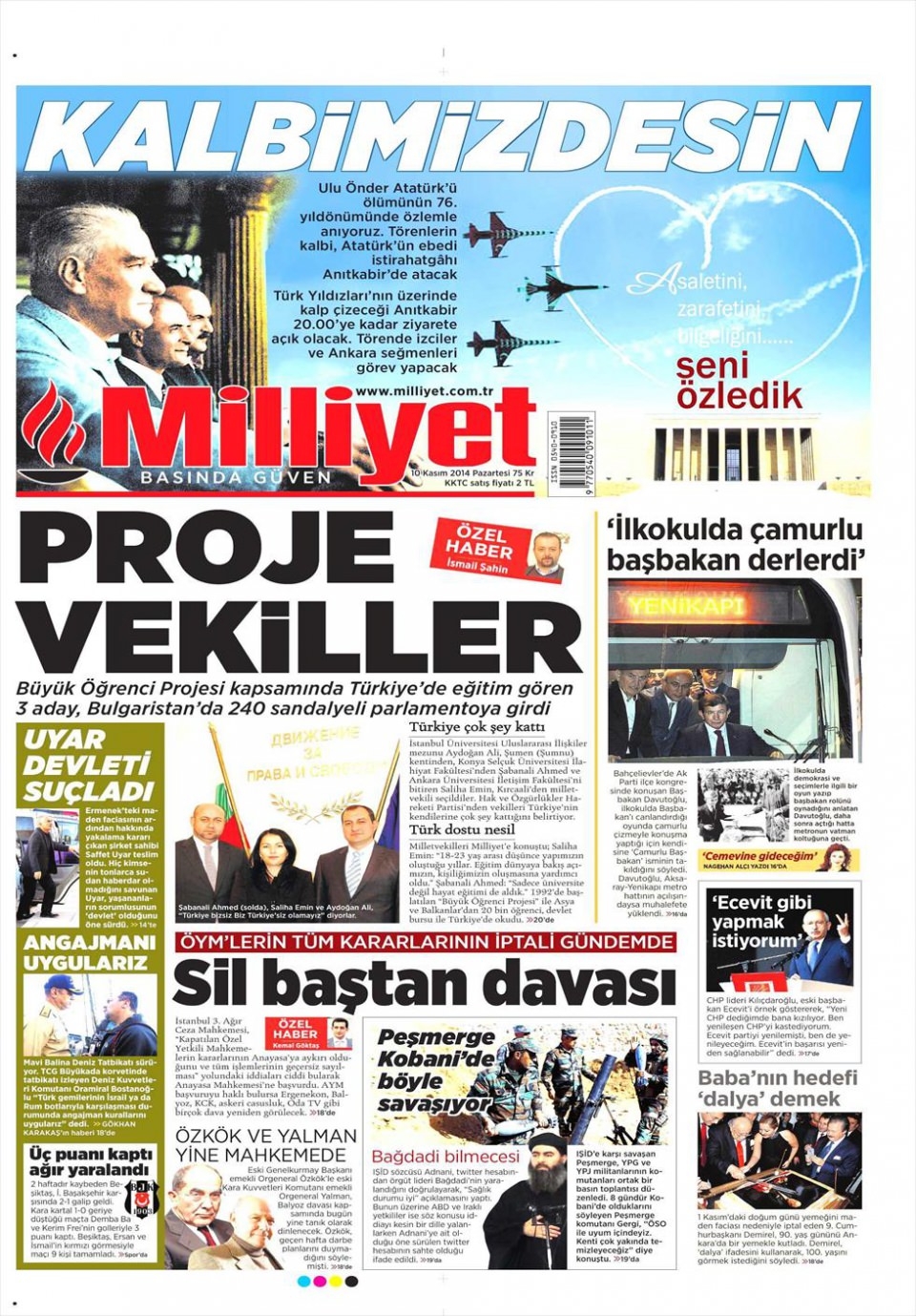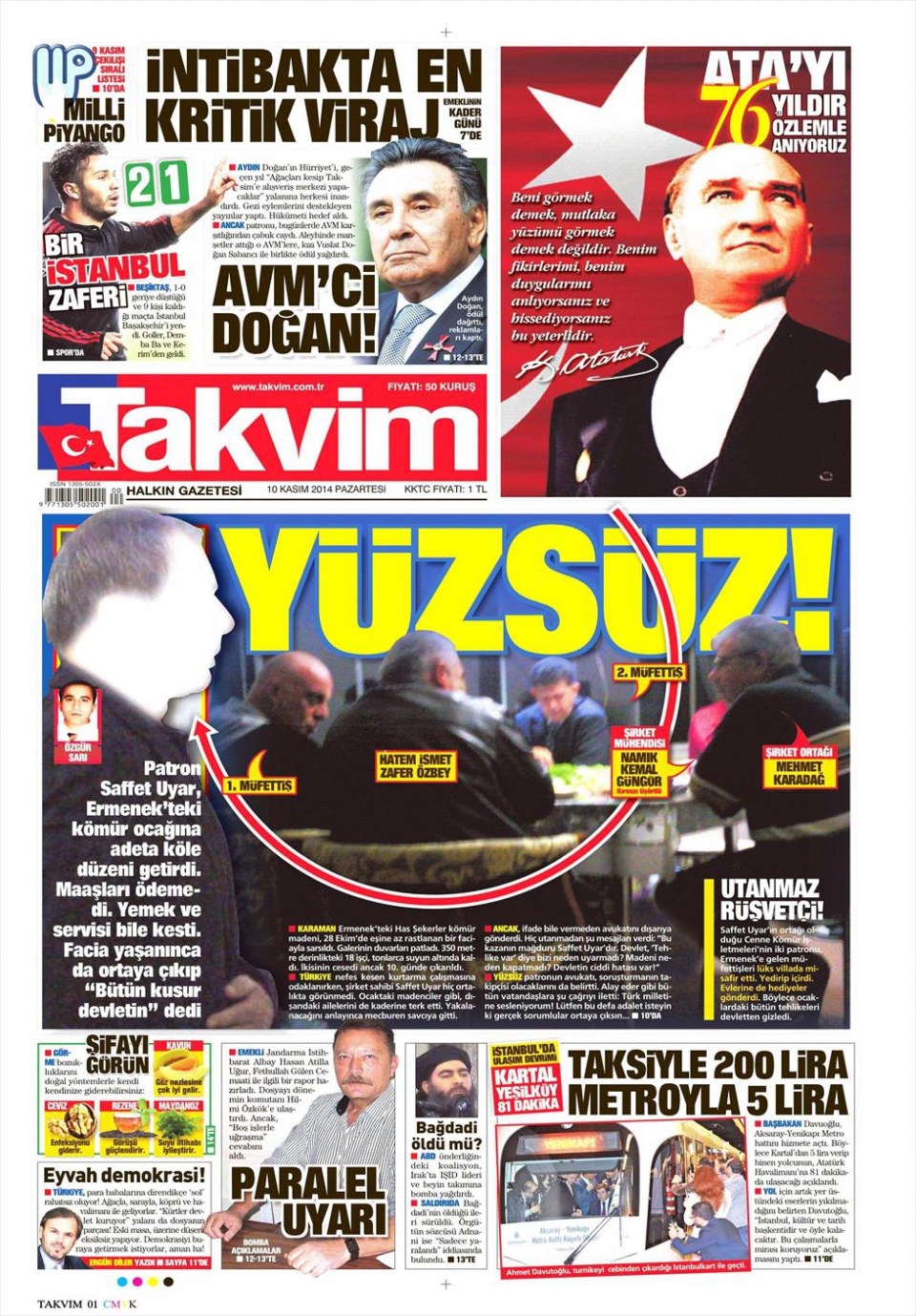 10 Kasım 2014 gazete manşetleri