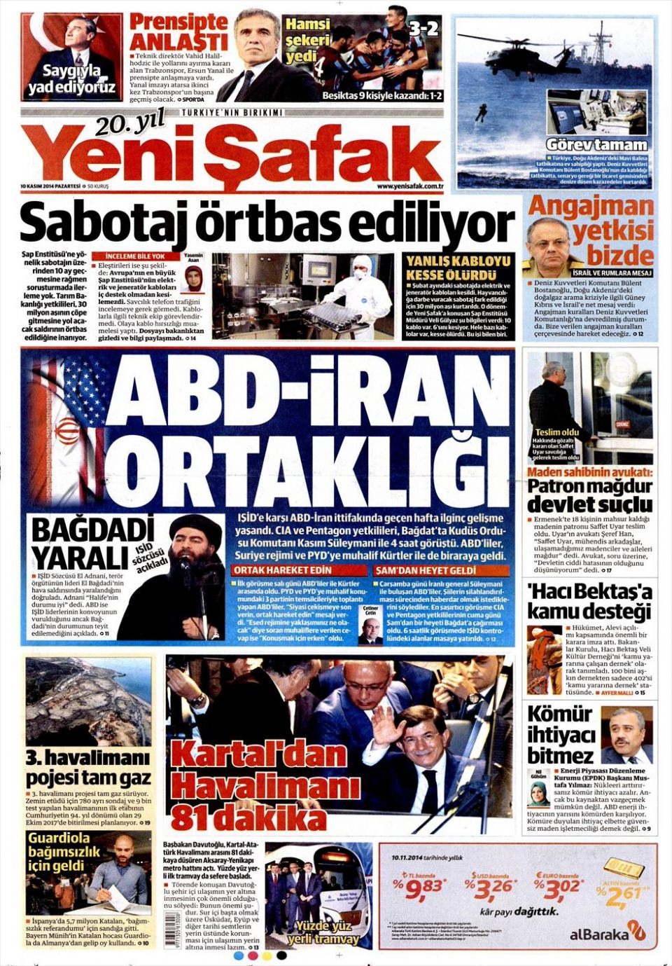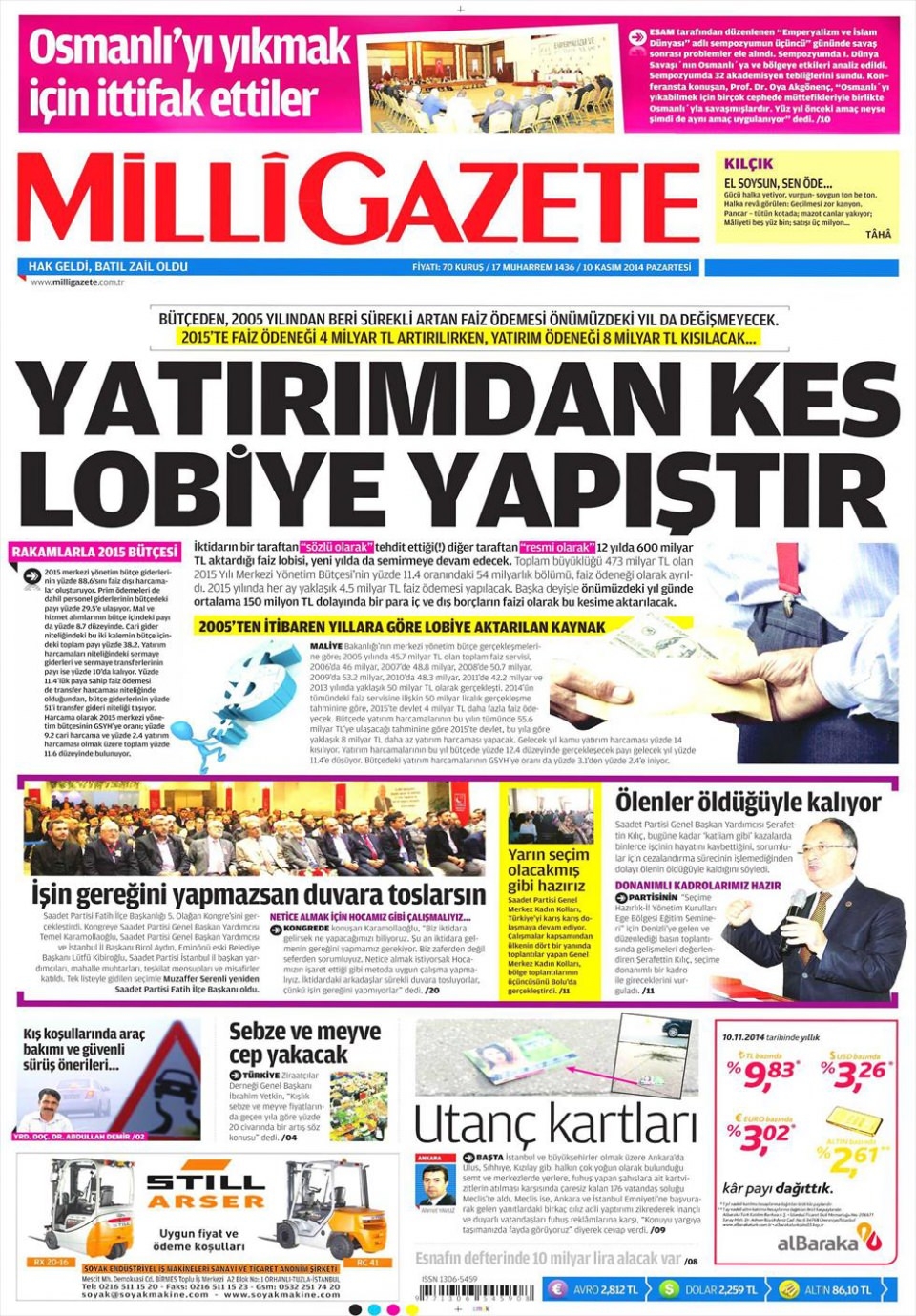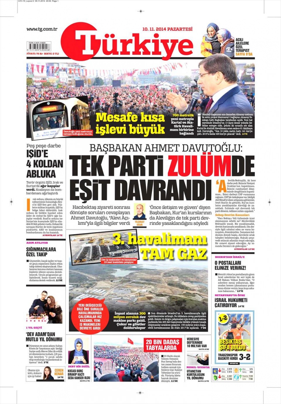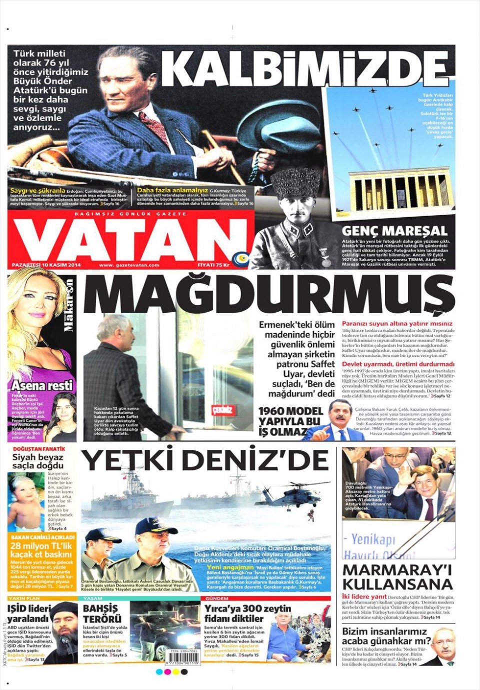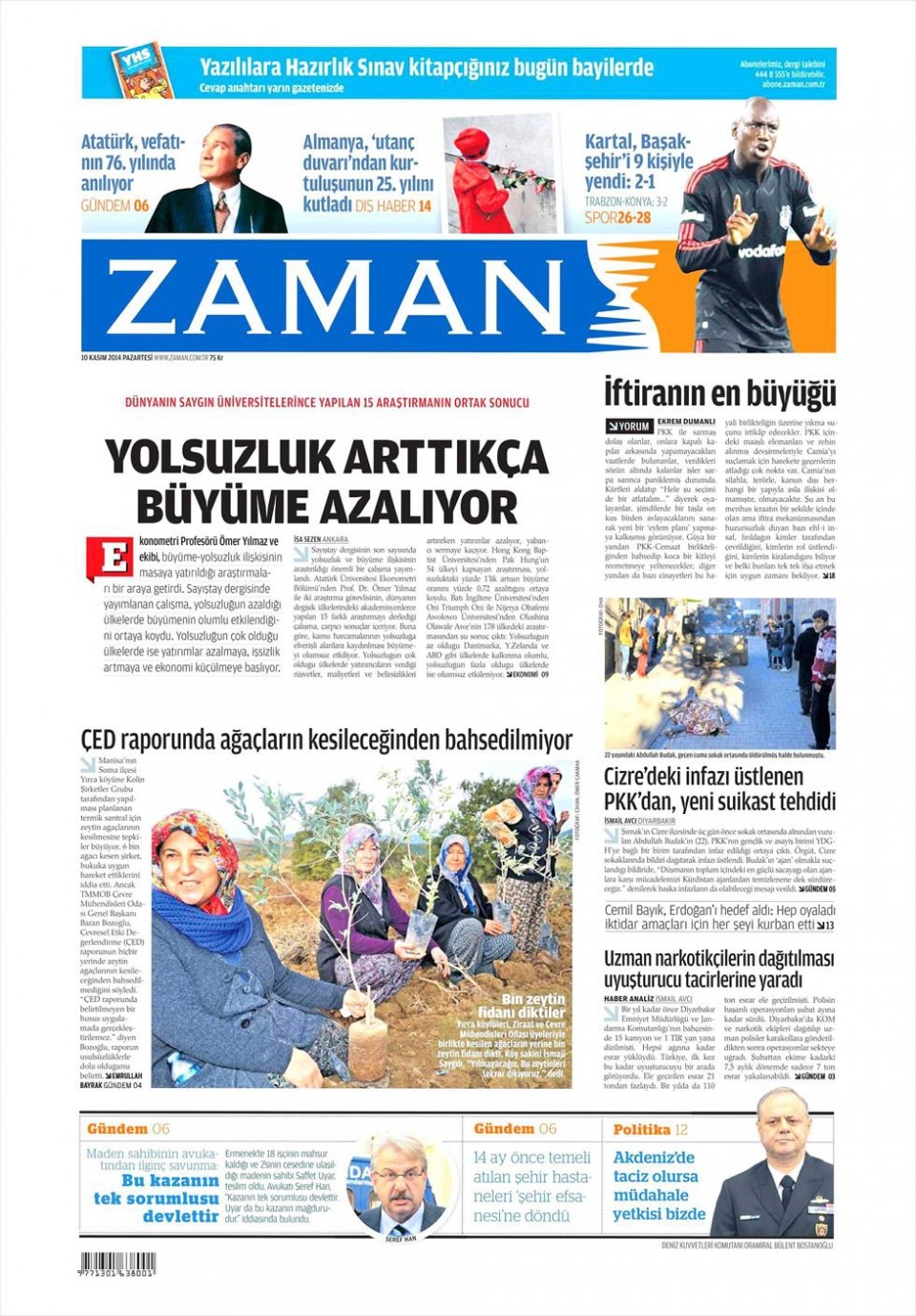 10 Kasım 2014 gazete manşetleri