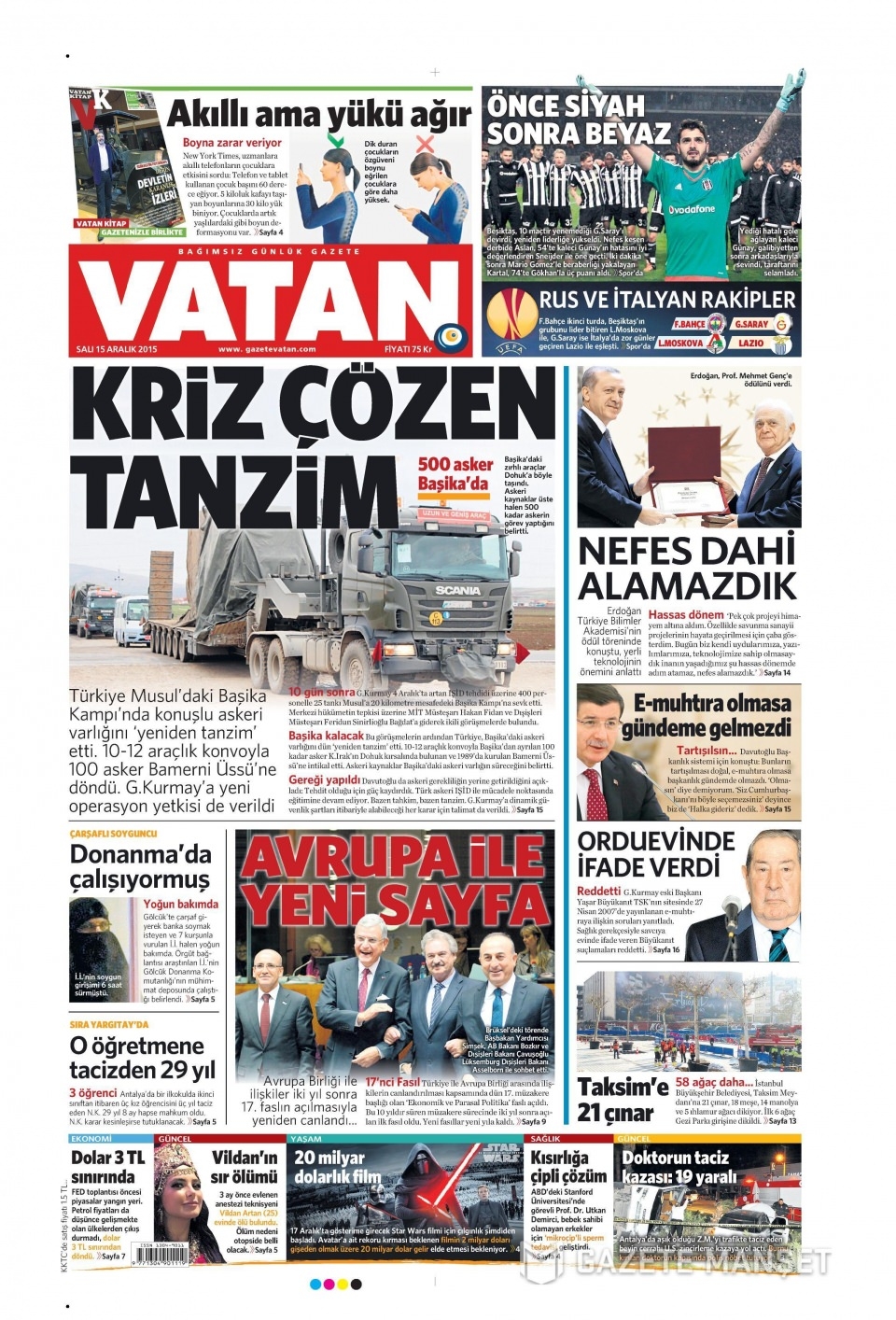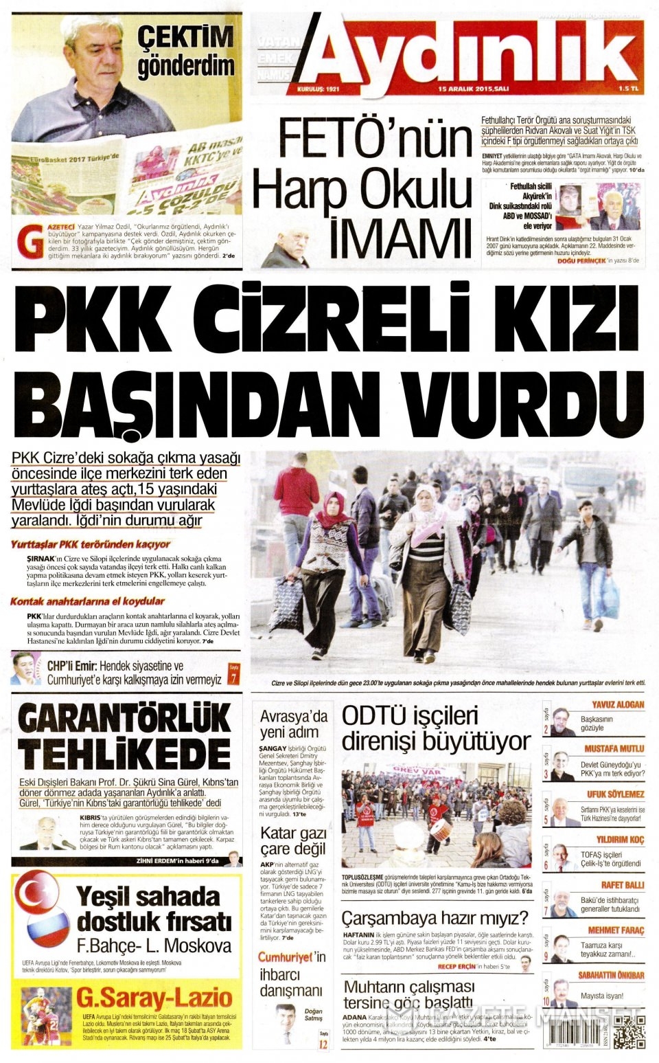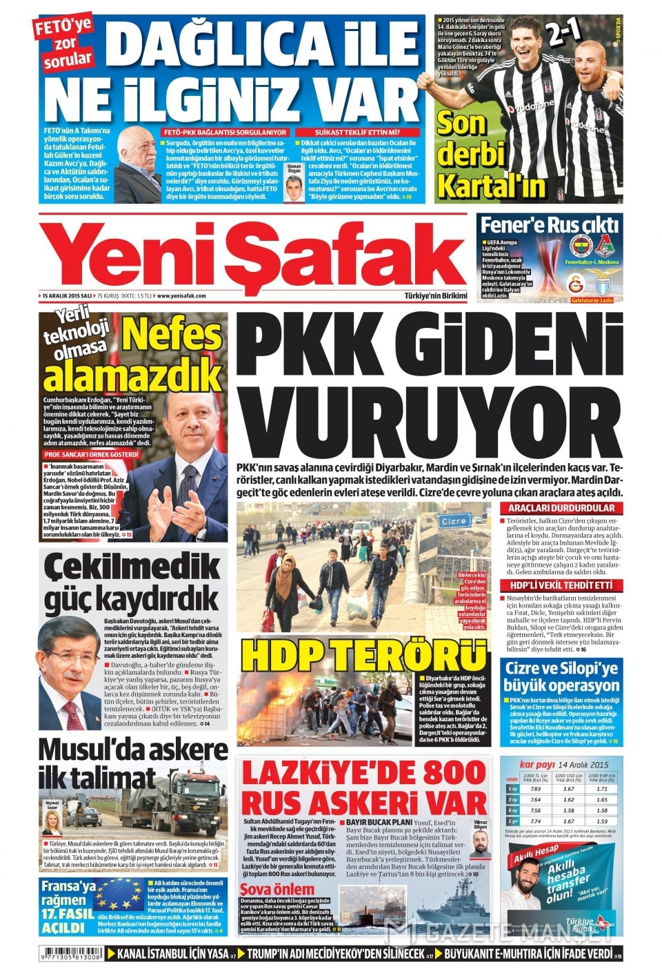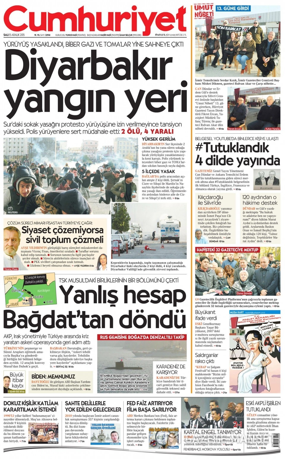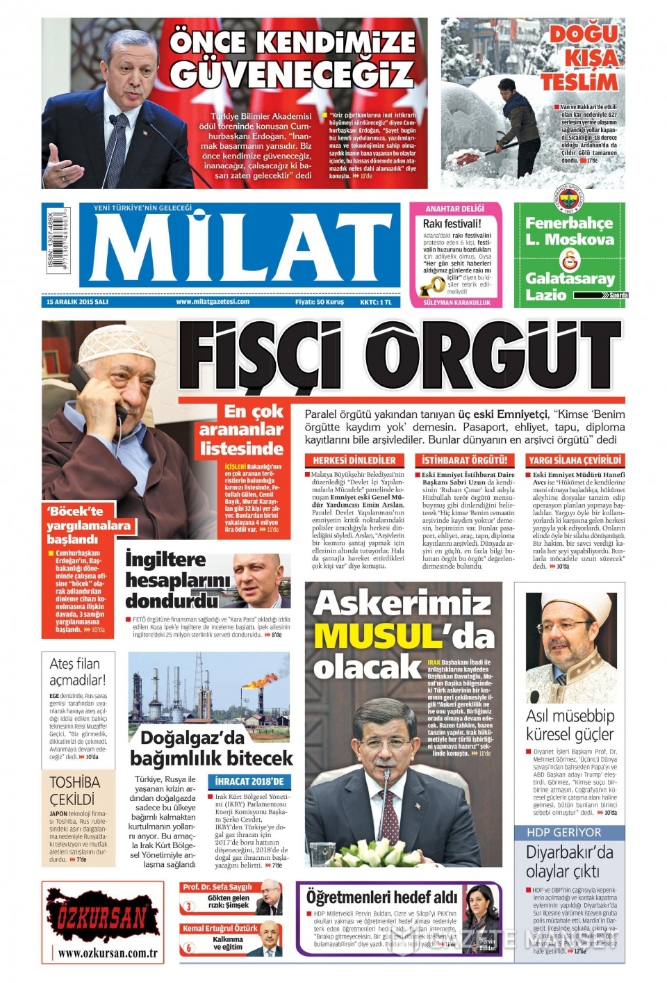 15 Aralık 2015 gazete manşetleri