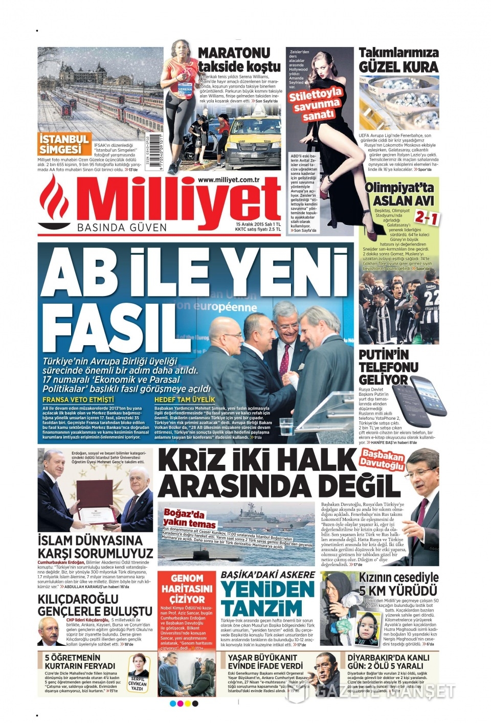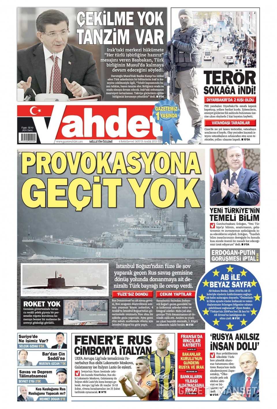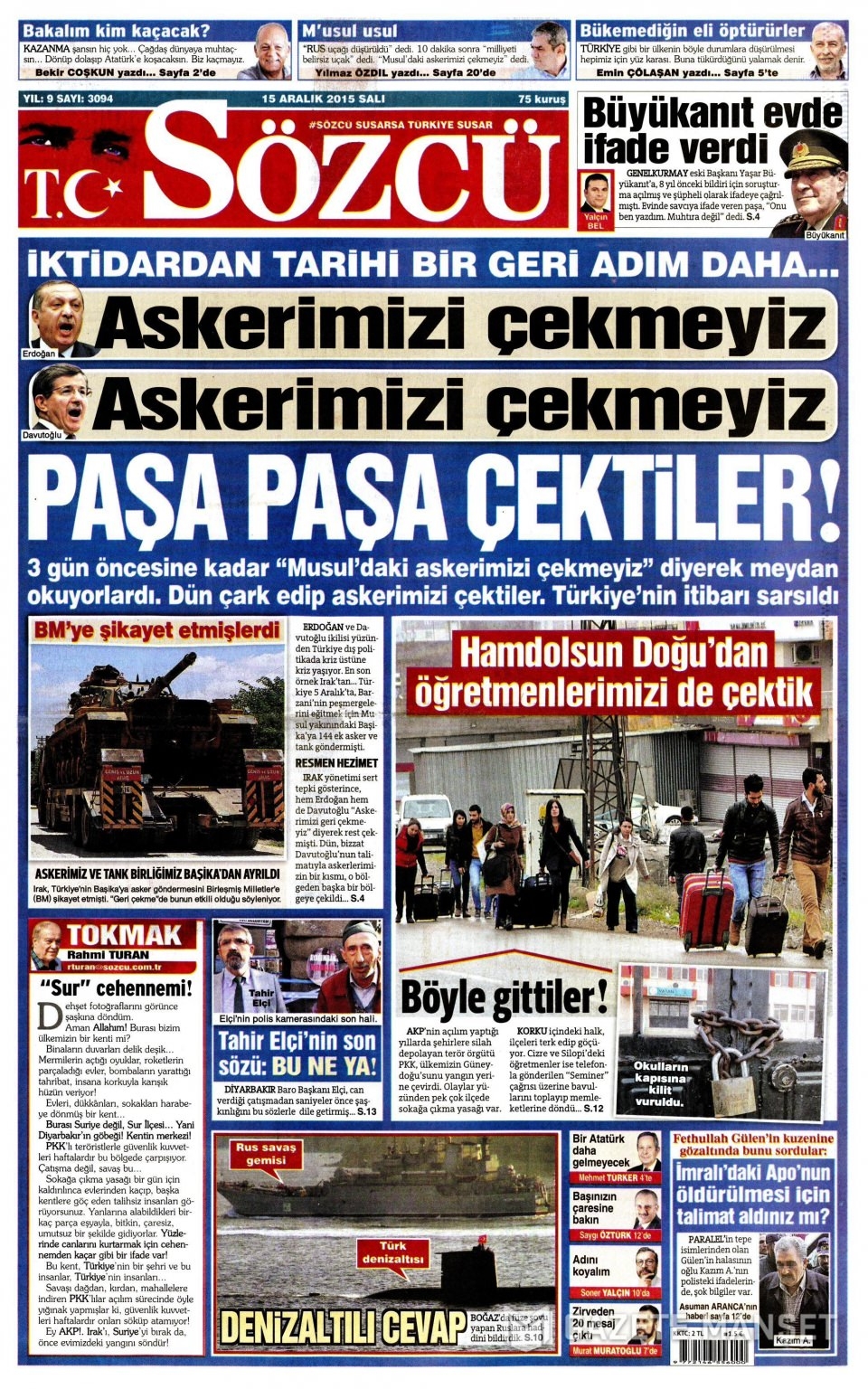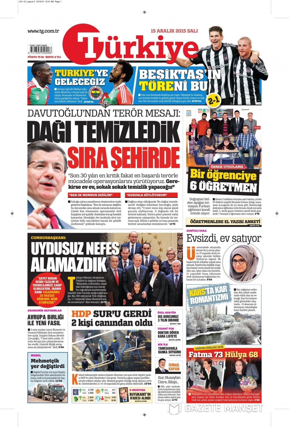 15 Aralık 2015 gazete manşetleri