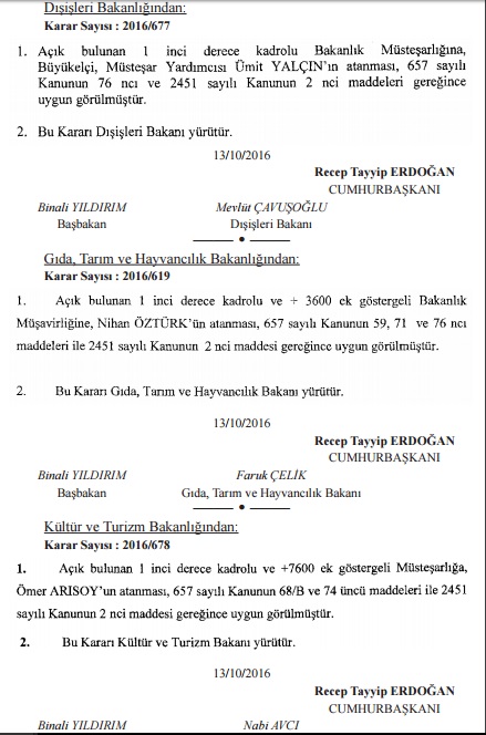 Dışişleri, Gıda, Tarım ve Hayvancılık ile Kültür ve Turizm Bakanlıklarına Ait Atama Kararları