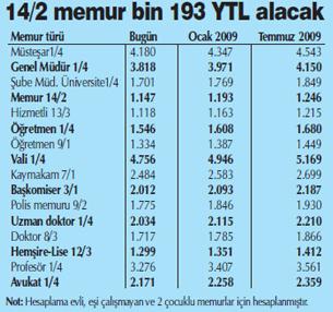 Toplu görüşmelerde belirlenen ve bütçeye bu çerçevede ödenek konulan yeni zamlara göre; evli ve eşi çalışmayan, aynı zamanda da 2 çocuğu olan 13'ün 3'ündeki bir devlet memurunun halen bin 118 YTL olan maaşı, yılbaşında bin 163 YTL, temmuz ayında da bin 215 YTL olacak.