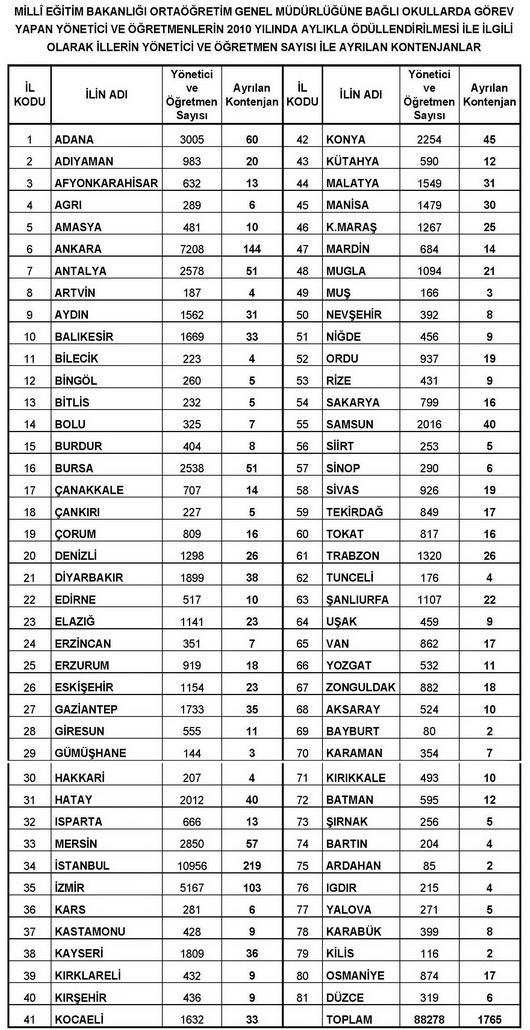 Orta Öğretim Genel Müdürlüğüne bağlı genel liseler, fen liseleri, Anadolu liseleri, güzel sanatlar ve spor liseleri ile sosyal bilimler liselerinde görevli yönetici ve öğretmenlerden 2010 Mali yılı içinde aylıkla ödüllendirilebilecekler için illere verilen kontenjan sayısı listede belirtilmiştir.