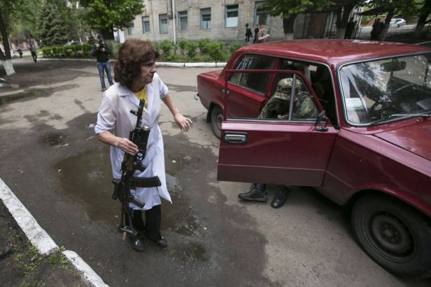 Ukrayna kasabasında silahlı bir adam tıbbi personel tarafından yardım istiyor.