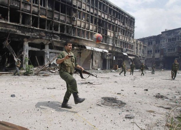 Suriyeli askerler Humus'ta bir mahellede top oynuyor.