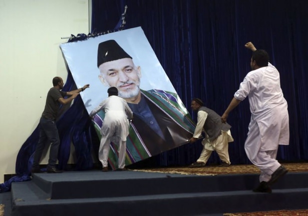 Kabil'de Abdullah destekçileri bir buluşma öncesi Hamid Karzai'nin portresini aşağı indiriyor.