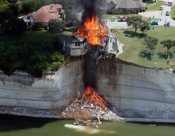 Teksas'ta bir ev yanarak göle düştü. (Brandon Wade)