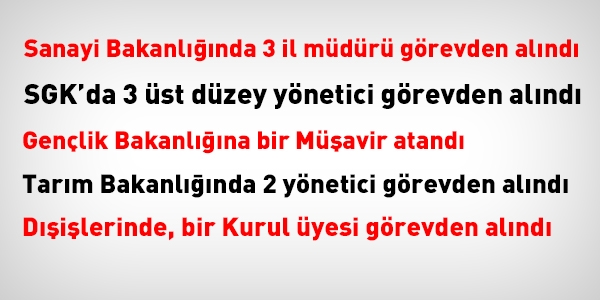 Bilim Sanayi ve Teknoloji Bakanlığı'na bağlı Erzincan Bilim, Sanayi ve Teknoloji İl Müdürü Hüseyin Erdem, Uşak Bilim Sanayi ve Teknoloji İl Müdürü Barış Kılınç, Düzce Bilim Sanayi ve Teknoloji İl Müdürü Erdal Gevrek, başka görevlere atanmak üzere görevlerinden alındı.