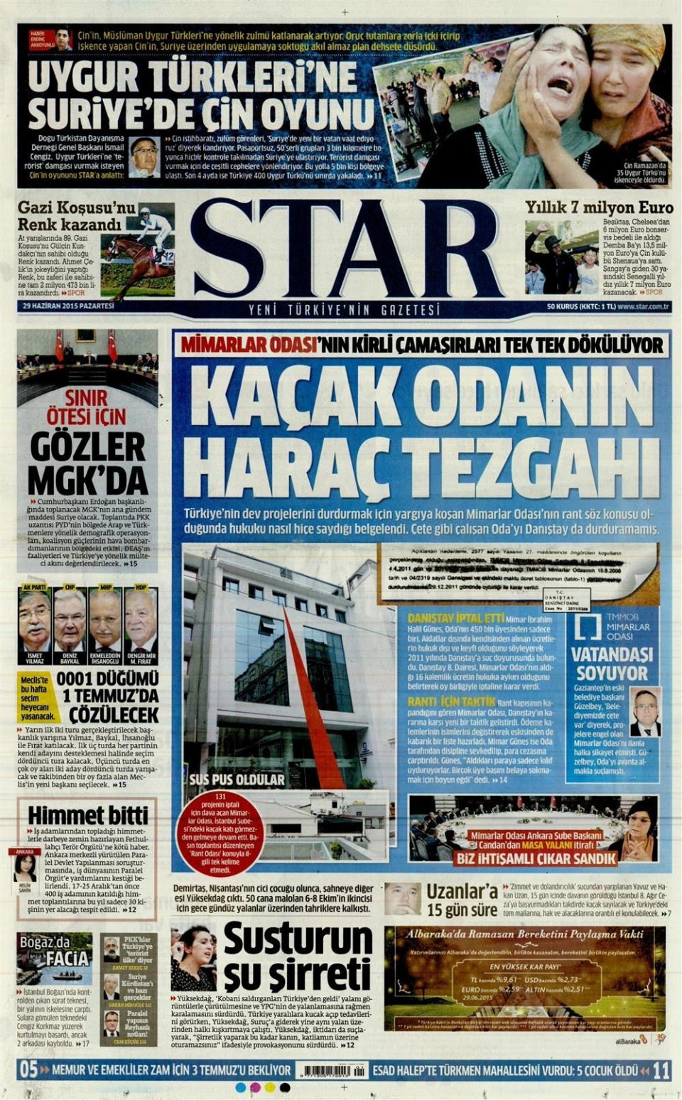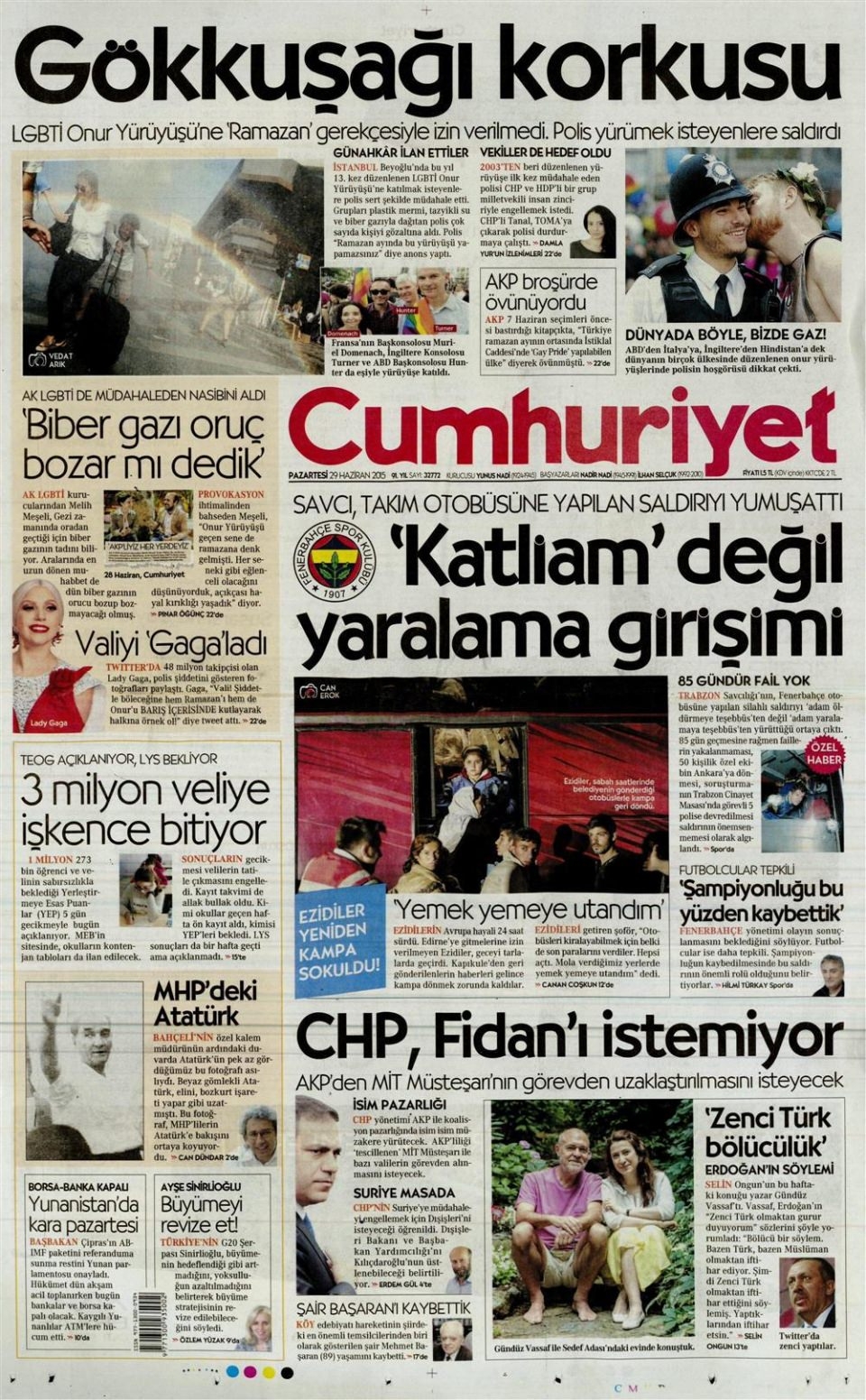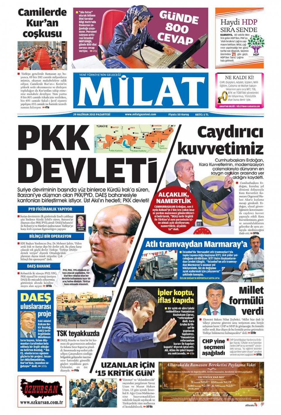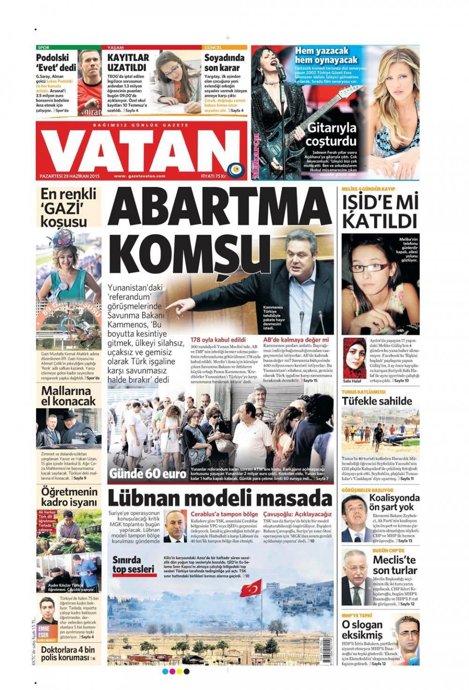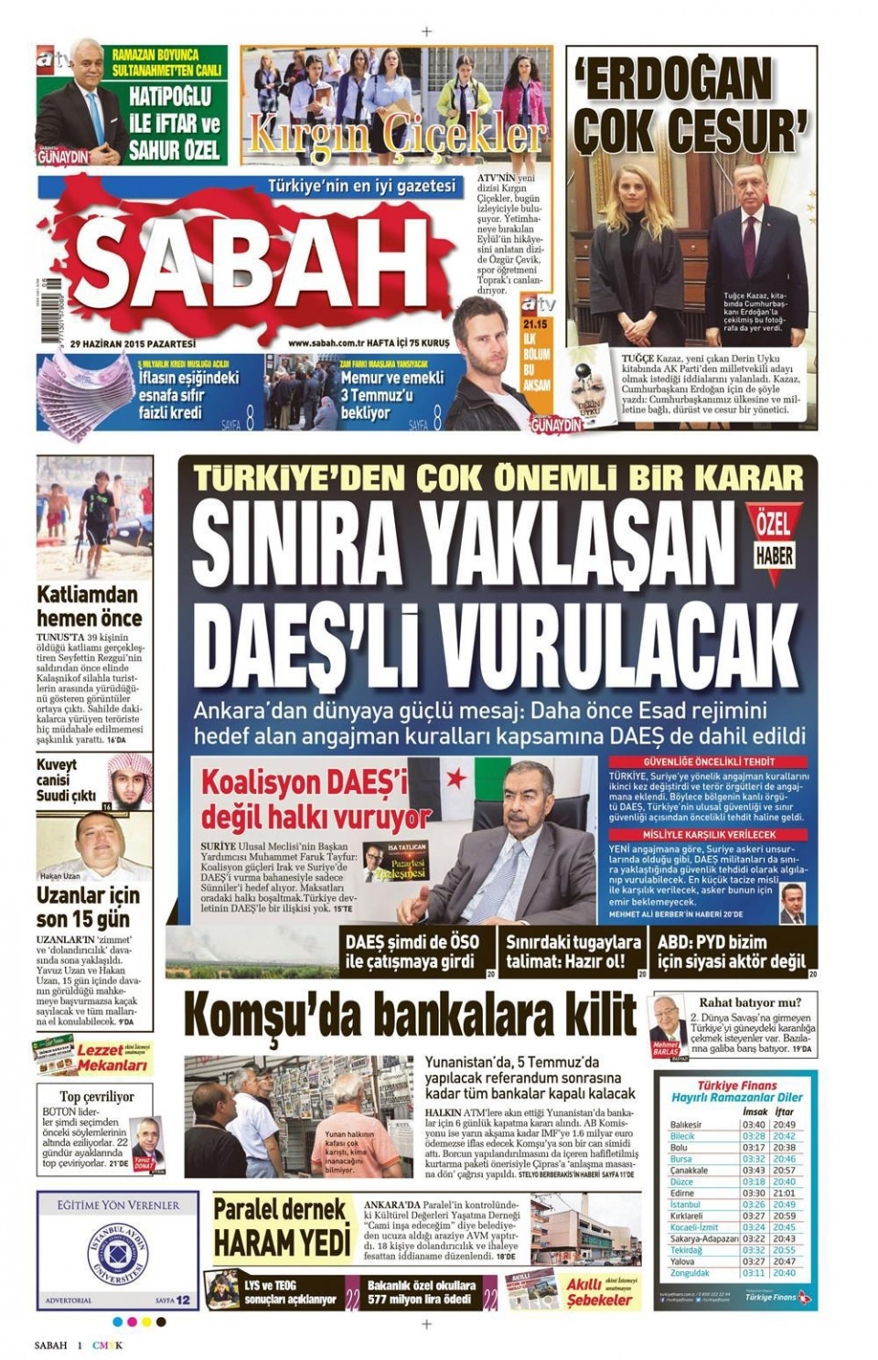 29 Haziran 2015 gazete manşetleri
