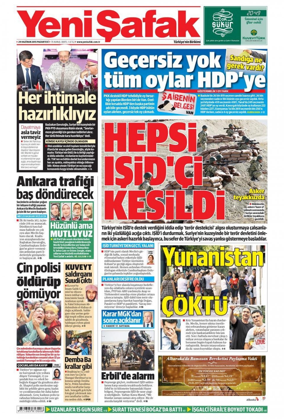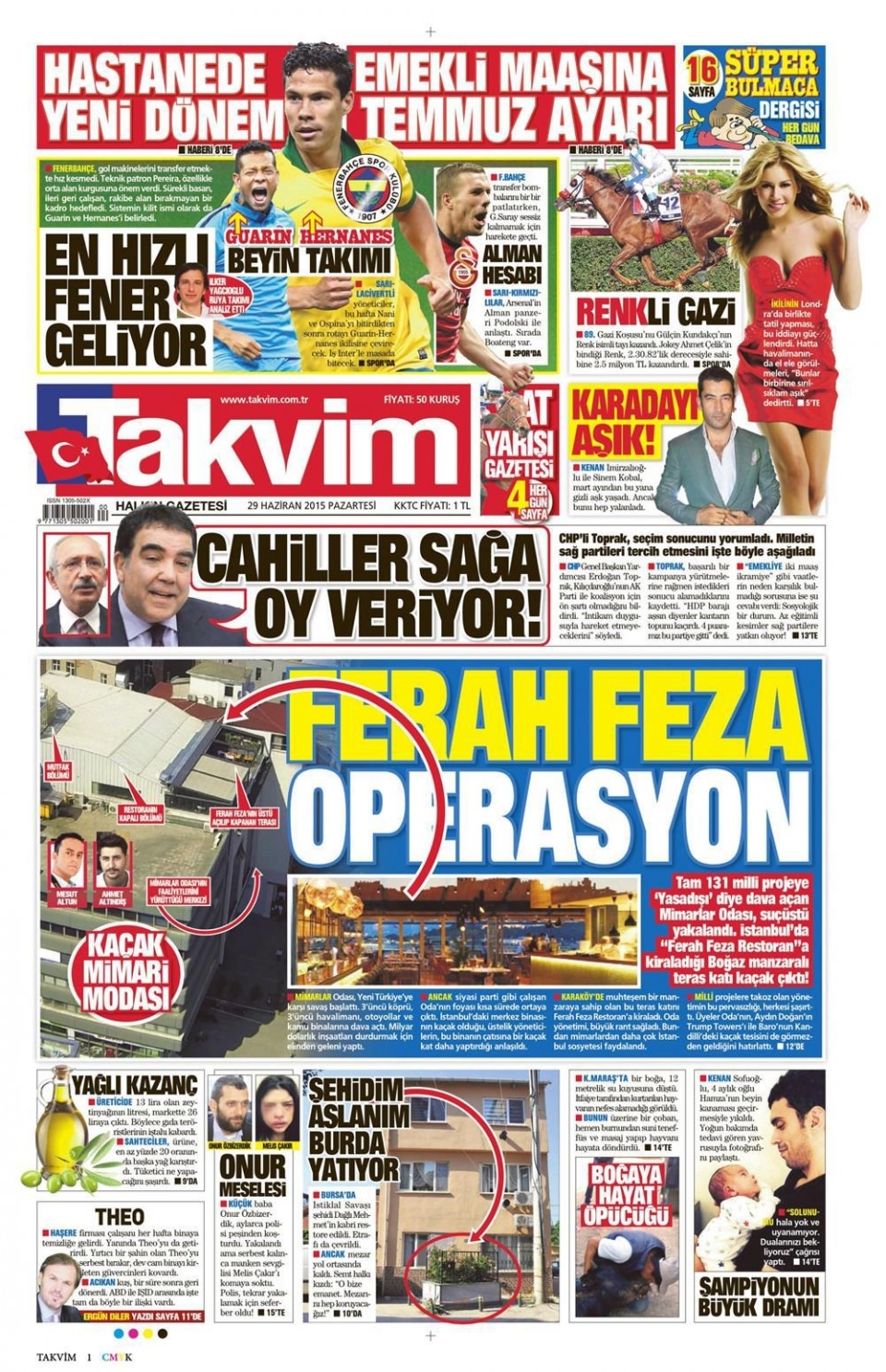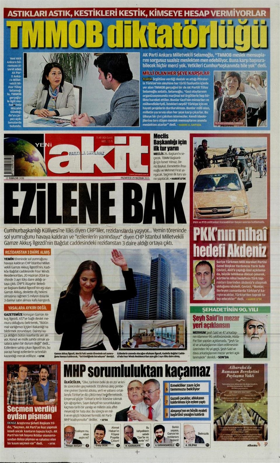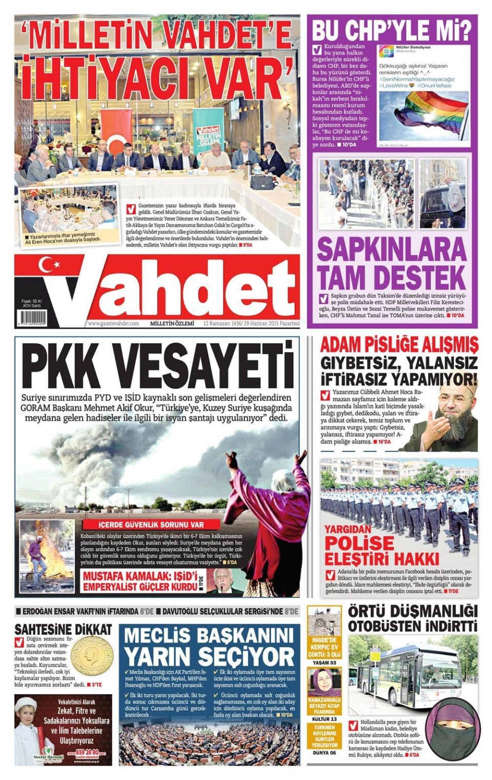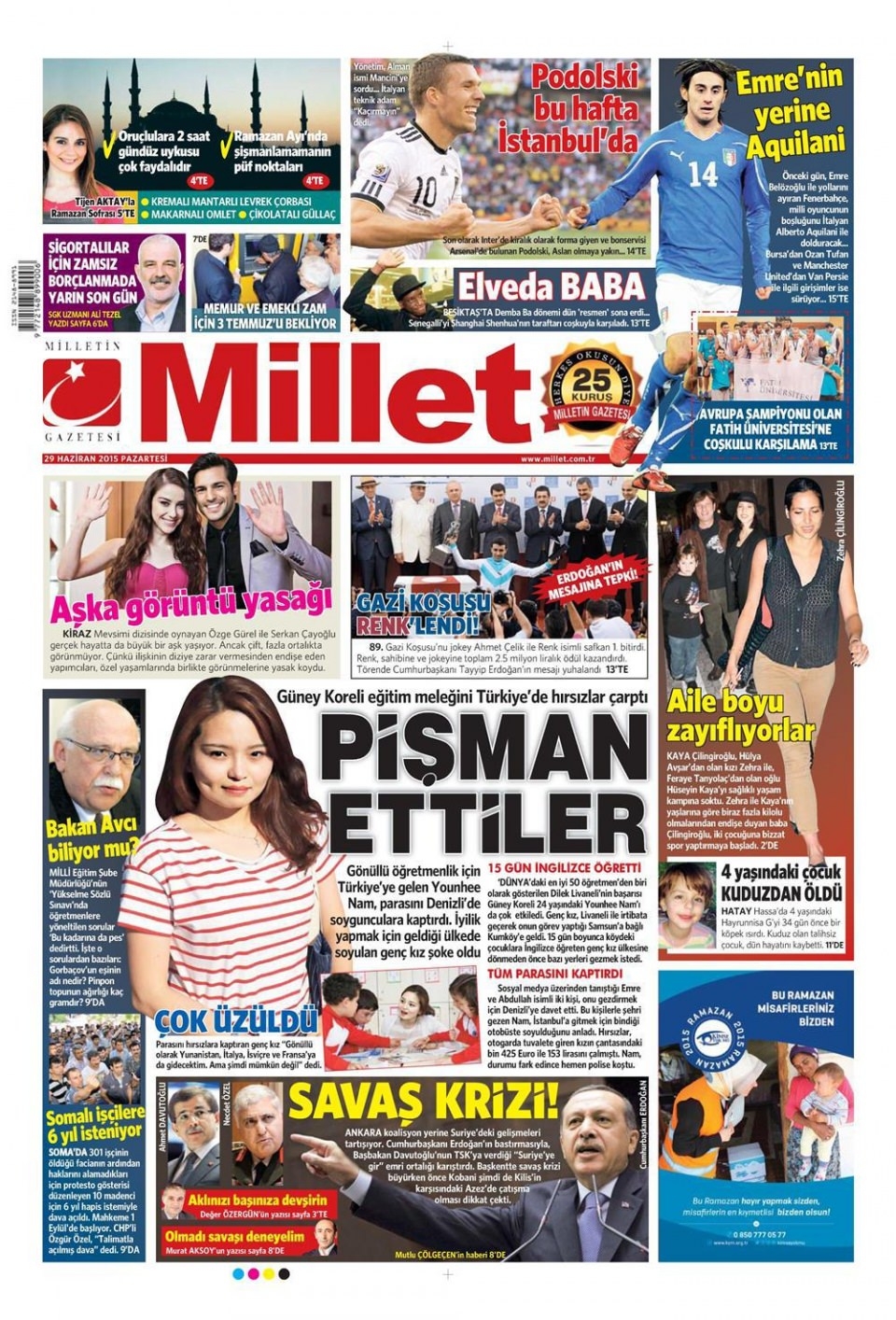 29 Haziran 2015 gazete manşetleri