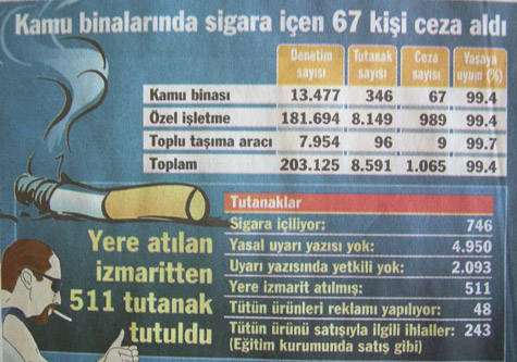 Temmuz ayından bu yana en çok özel işletmeler denetlendi. Resmi rakamlara göre, 181 bin özel işletme, 13 bin kamu kurumu ve 8 bin toplu taşıma aracına denetim yapıldı. 4 ay içerisinde yapılan 203 bin denetimde binden fazla ceza kesildi. Cezaların önemli bir bölümü, sigara içilmediğini gösteren yasal uyarı yazısı taşınmadığı için verildi. Ayrıca uyarı yazısında yetkili kişi adı yazılmaması, yere izmarit atılması veya kapalı mekanda sigara içilmesi nedeniyle de kurum veya kişilere cezalar verildi.