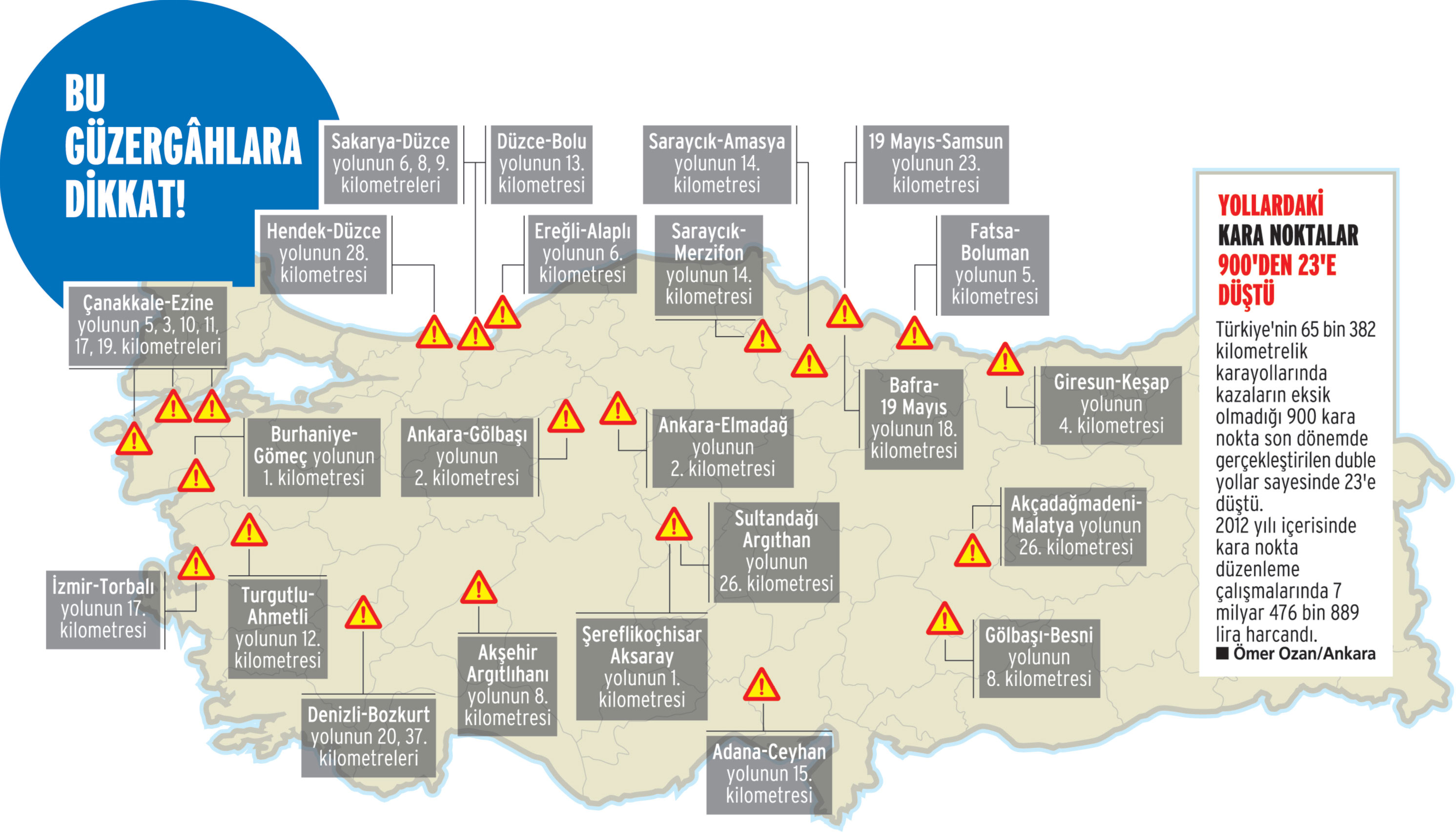 Ölümlü ve yaralamalı kazaların en yoğun yaşandığı kara noktalar Haliç Köprüsü, eski Büyükdere Caddesi, Maltepe, Pendik D-100 Karayolu, D-100 Çobançeşme rampası ile Avcılar Köprüsü arası. Sürücüler bu noktalarda daha dikkatli olsunlar" diye konuştu.