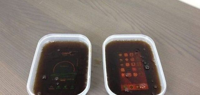 Önce eşit büyüklükte iki plastik kab içinde ki telefonlar kola ile tamamen dolduruluyor.
