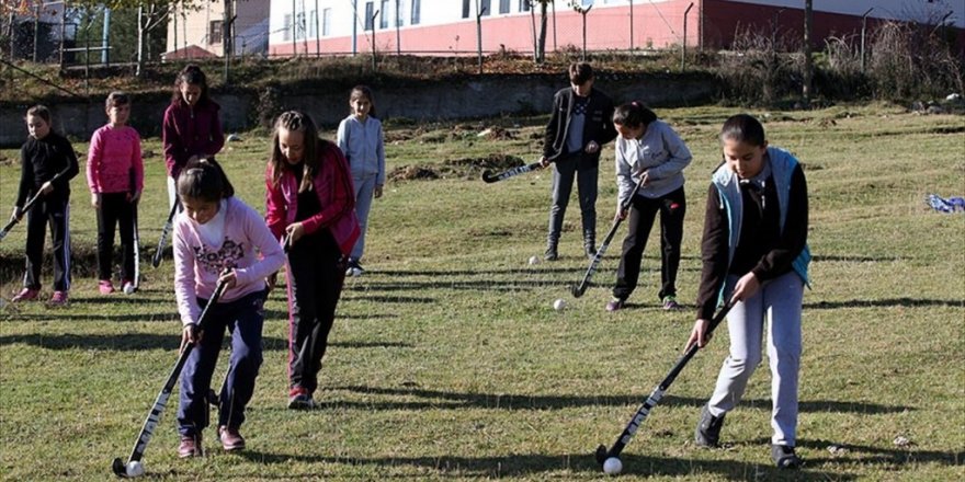 Taşımalı eğitim öğrencileri çim hokeyi öğreniyor