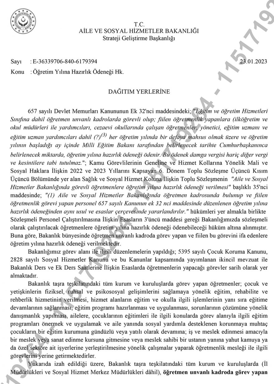 Aile ve Sosyal Hizmetler Bakanlığı, bakanlık taşra teşkilatında görev alan öğretmenlere, belirli görevleri yapmak kaydıyla, öğretim yılına hazırlık ödeneğinin verilebileceğini belirtti