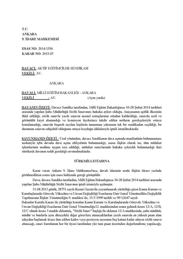 Aktif Eğitimciler Sendikası olarak Milli Eğitim Bakanlığınca 10-28 Şubat 2014 tarihleri arasında yapılan Şube Müdürlüğü Sözlü Sınavının; hukuka aykırı olduğu, Anayasanın eşitlik ilkesinin ihlal edildiği, sözlü sınavla yazılı sınavın nesnel sonuçlarının ortadan kaldırıldığı, sınavda sesli ve görüntülü kayıt alınmadığı ve komisyon üyelerince takdir edilen notların gerekçeleriyle ortaya konulamadığı, sınavda başarılı sayılan kişilerin tamamına yakınının tek bir sendikadan seçildiği, bu durumun sınavın subjektif olduğunu ortaya koyduğu iddialarıyla iptali için 05.05.2014 tarihinde idare mahkemesine dava açmıştık.