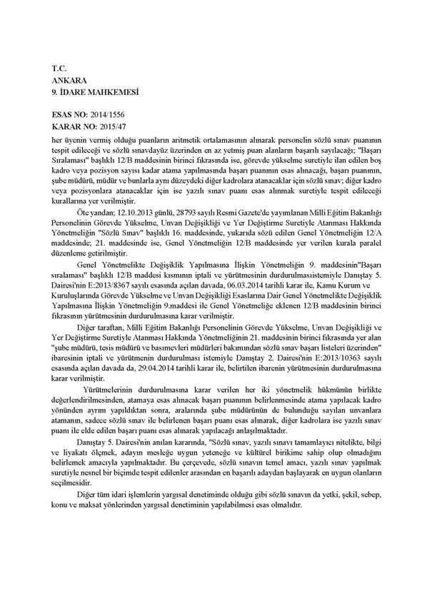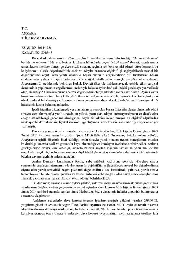 Ankara 9. İdare Mahkemesi 22.01.2015 tarih ve 2015/47 sayılı esastan verdiği kararıyla, şube müdürlüğü atamalarını oybirliğiyle iptal etti.
