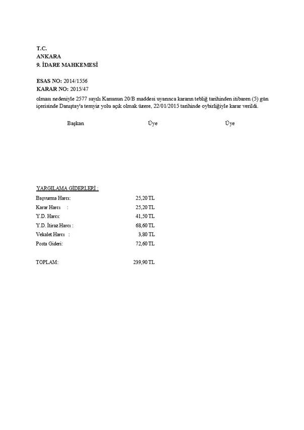 Nihayetinde davanın görüşülmeye devam edildiği Ankara 9. İdare Mahkemesi 22.01.2015 tarih ve 2015/47 sayılı Kararında dava konusu işlemin iptaline oybirliğiyle karar verdi.