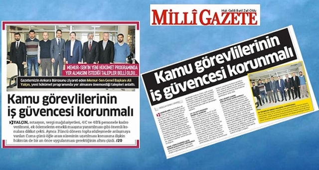 Memur-Sen Genel Başkanı Ali Yalçın Milli Gazete'ye önemli açıklamalarda bulundu. Yalçın, yeni hükümet programında çalışma hayatı, kamu görevlileri sendikacılığı ve kamu personel sistemi kapsamında yer verilmesini önemsediği konuları anlattı. Kamu görevlilerinin iş güvencesinin tartışıldığı ya da sona erdirileceği algısı uyandıracak kavram, içerik ve hedeflerin kesinlikle yeni Hükümet Programı'nda yer almaması gerektiğini söyleyen Yalçın, çalışma hayatının önemli konularına değindi.