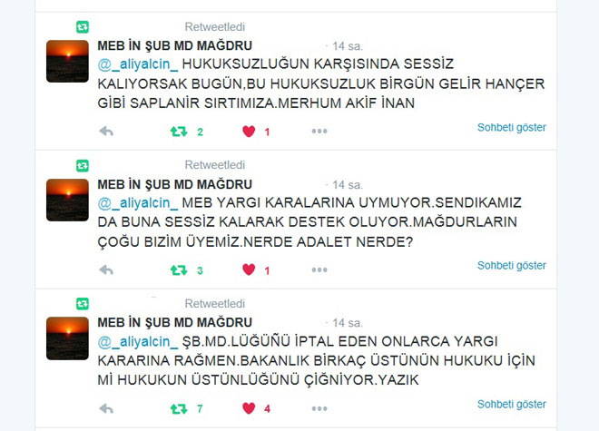 Mağduriyetlerini sosyal medya yoluyla dile getiren Şube Müdürlüğü Mağdurları, Memur-Sen ve Eğitim-Bir-Sen Başkanı Ali YALÇIN'a hitaben yazılan twitter mesajında Eğitim-Bir-Sen'in kurucusu merhum Mehmet Akif İNAN'ın sözlerine yer verilmiş.