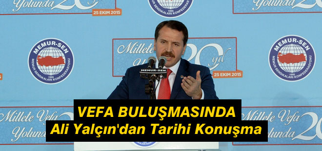 Memur-Sen'in millete vefa yolunda 20, yılını kutlamak için bir araya geldiklerini vurgulayan Yalçın, sözlerini şu şekilde sürdürdü: "Biz, milletimize, ülkemize, ümmete ve insanlığa vefadan hiç vazgeçmedik. Hiç vazgeçmeyeceğiz. Ümmetin, mazlum ve mağdurların vefa beklentisine hiç kulak tıkamadık, hiçbir zaman sırt dönmedik/dönmeyeceğiz. "Dünya Beşten Büyüktür" haykırışını hissiyatımızın ve isyanımızın ifadesi olarak gördük görmeye devam edeceğiz. Ötekileştirilenlerin çığlığı Malcolm-X'i, Ülkesini işgale yeltenenlere direnen Ömer Muhtar'ı, Kardeşlerini katledenlere karşı intikam almayı aklından geçirmeyen ancak katledilişlerini de aklından çıkarmayan Bilge Lider Aliya'yı, İnsanlık henüz ölmedi dercesine İsrail tanklarının altında can veren Rachel Cori'yi, Mısır halkının iradesini temsil eden ve Mısır Zindanlarında çağın Firavun'larına direnen Muhammed Mursi'yi, Ölüme giderken dahi "milletim" diyen Menderes'i, Haddini bildirmek isteyenlere "bana haddimi ancak millet bildirir" diyen Özal'ı, "Namlusu millete dönen tanka selam durmam" diyen Muhsin Başkan'ı, Olimpos'un çocuklarının oyunlarına karşı Hira dağının duruşunu sergileyen HAKK'ı, HAKK'a teslimiyetiyle Savunan Adam Necmettin Erbakan"ı, Şeytanı bilince karşı Muhammedi şuuru yüklenen millet adamı, siyonizme had bildiren uzun adamı, milleti iradesiyle buluşturmak için dik duran ve diz çökmeyen Direnen Adam'ı Soylu mücadelemizin kurucusu Kudüs Şairi Mehmet Akif İnan'ı anlamaya/yaşamaya/yalnız bırakmamaya/yanlarında durmaya devam edeceğiz.