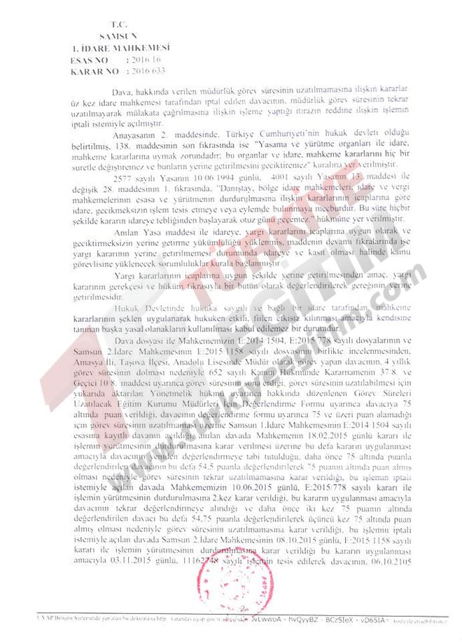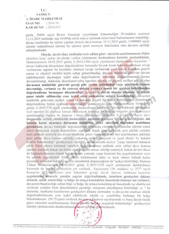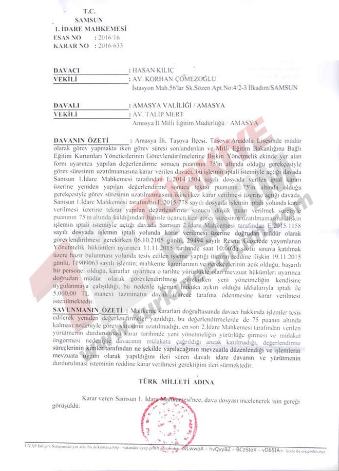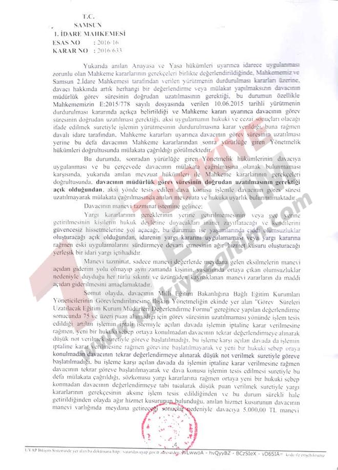 Amasya İli Taşova İlçesi,Taşova Anadolu Lisesinde müdür olarak görev yapmakta iken görev süresi sonlandırılan ve Milli Eğitim Bakanlığı’na Bağlı Eğitim Kurumları Yöneticilerinin Görevlendirilmelerine ilişkin Yönetmeliğin ekinde yer alan Ek-1 değerlendirme formu uyarınca yapılan değerlendirme sonucu; tarafına 75 puanın altında değerlendirme yapılan üyemiz bu işlemin iptali istemiyle açtığı davayı kazanmış işlemin uygulanması aşamasında yeniden 75 puanın altında değerlendirme yapılmış açtığı ikinci davayı da kazanması üzerine işlemin uygulanması aşamasında yeniden tarafına 75 puanın altında değerlendirme yapılarak görev süresinin uzatılma işlemine 3.kere açtığı davada görev süresinin uzatılmamasına ilişkin işlemin iptali istemiyle açtığı davada Samsun İdare Mahkemesi tarafından E.2015/1158 sayılı dosyada işlemin iptali yolunda karar verilmesi üzerine doğrudan müdür olarak görevlendirilmesi gerekirken 06.10.2016 günlü 29494 sayılı Resmi Gazetede yayımlanan Yönetmelik hükümleri uyarınca sözlü sınava çağırılma işleminin iptali ve 5.000.00 TL tazminat istemiyle açtığı davada Samsun 1. İdare Mahkemesi’nin 28.04.2016 tarih 2016/16 E. 2016/633 K. sayılı kararıyla mülakata çağırılma işleminin iptali ile üyemizin manevi tazminat istemi kabul edilerek 5.000,00 TL manevi tazminatın işlemin tesisinde kişisel kusuru bulunan kişi veya kişilere rucü edilmek kaydıyla davalı idareden alınarak davacıya ödenmesine karar verilmiştir.