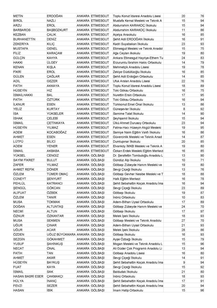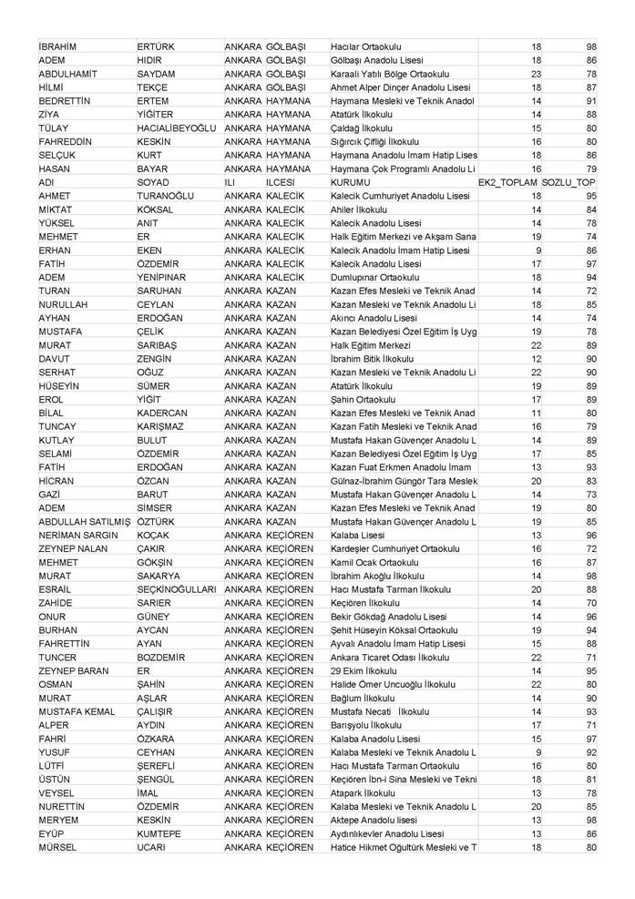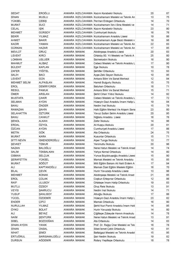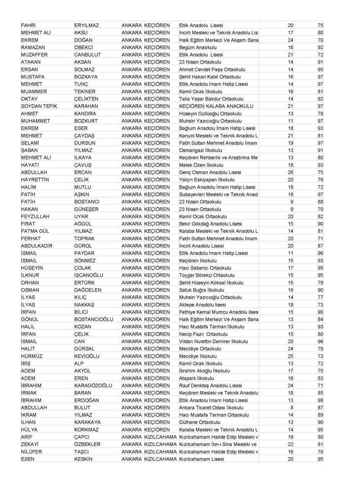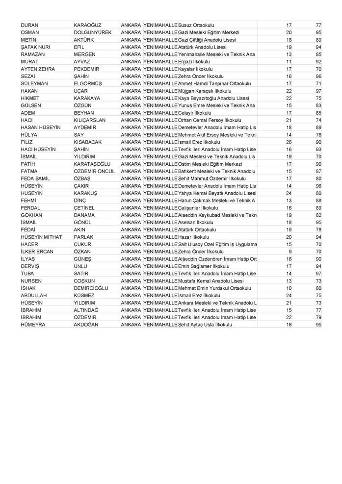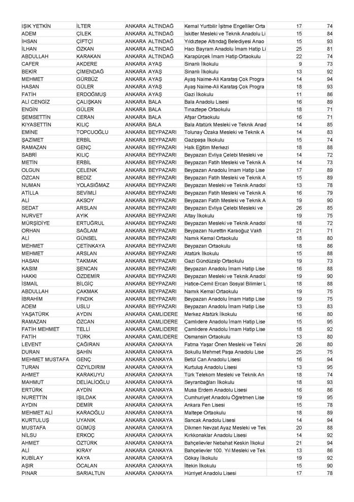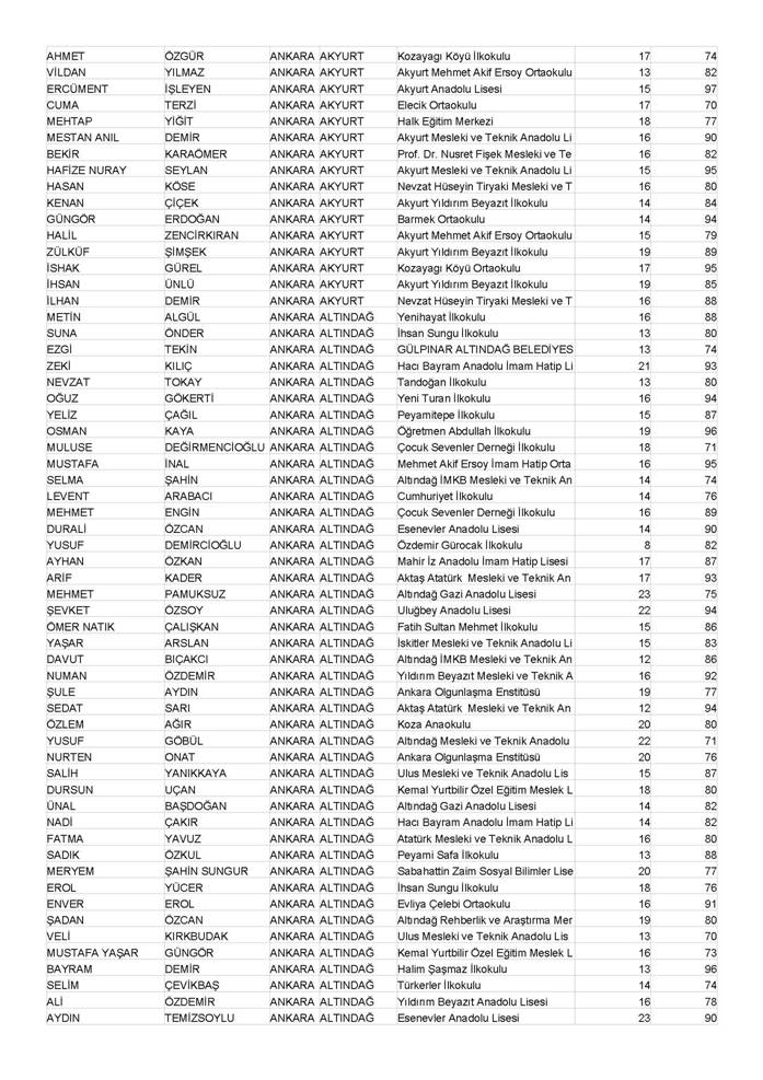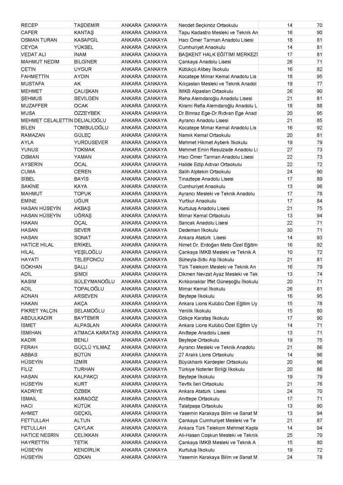 Ankara İl Milli Eğitim Müdürlüğü tarafından yapılan mülakatlar sonucu ,70 Puan ve üstü alıp başarılı olanların listesi:
