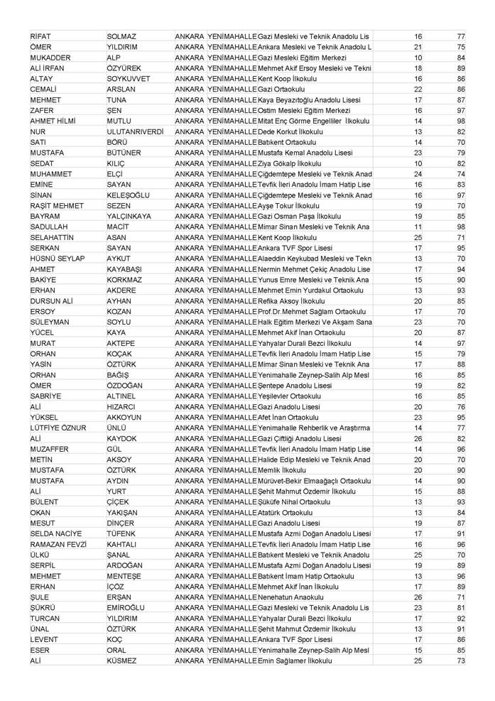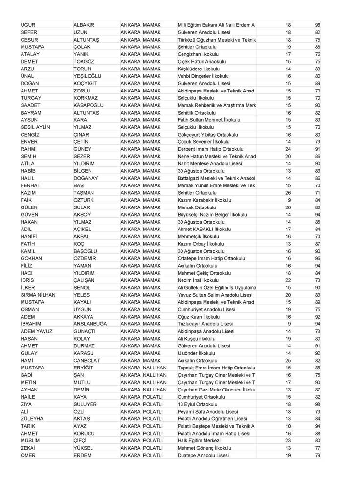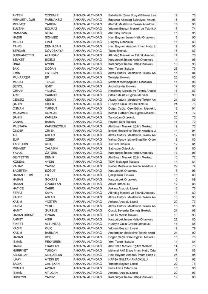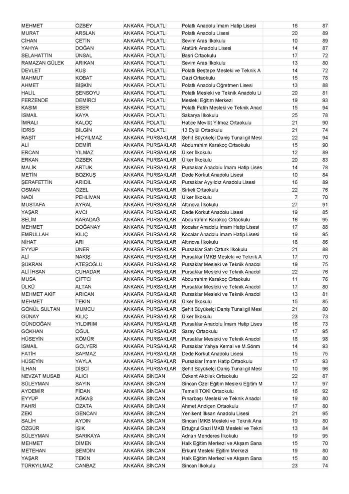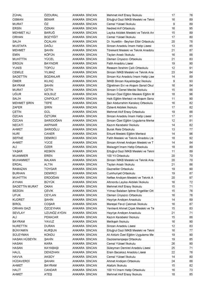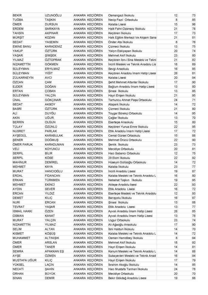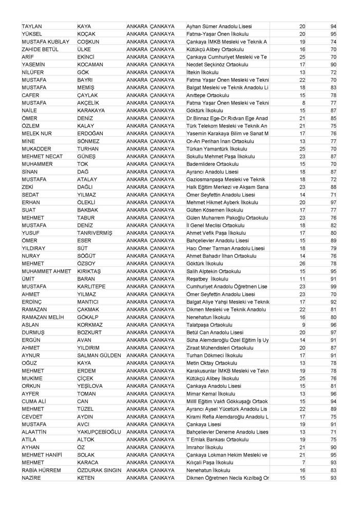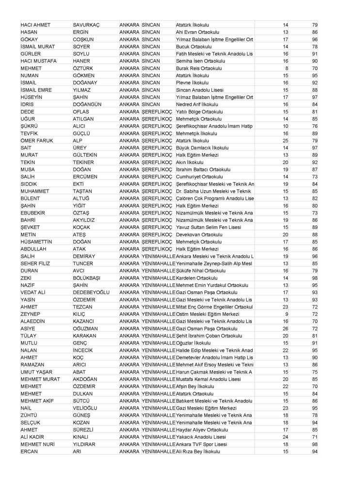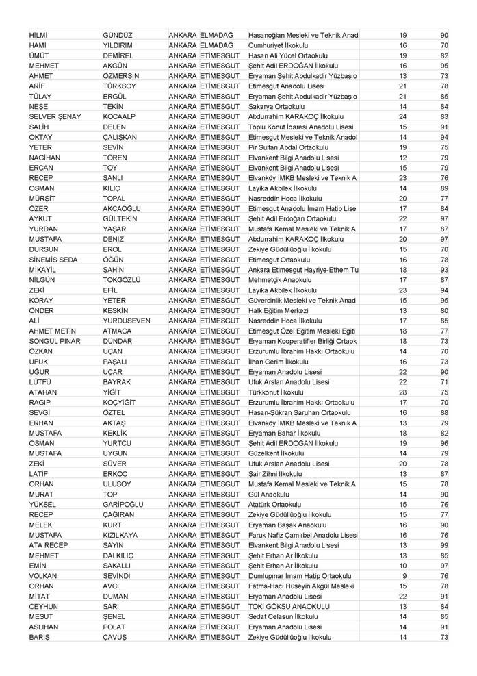 Ankara İl Milli Eğitim Müdürlüğü tarafından yapılan mülakatlar sonucu ,70 Puan ve üstü alıp başarılı olanların listesi: