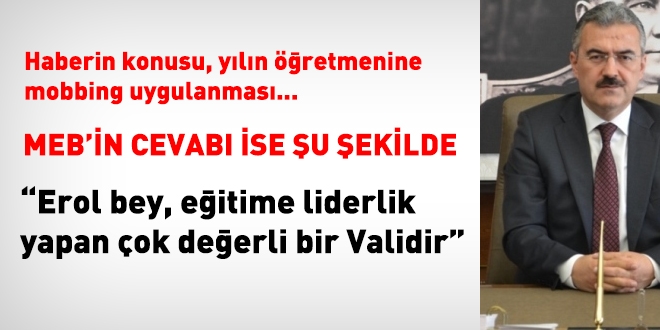 Adı geçen öğretmen Ahmet YAVUZ, iddia edildiği gibi yılın öğretmeni olmayıp, 2013 yılında 24 Kasım Öğretmenler Günü nedeniyle ilimizi temsilen Ankara'ya gönderilmiştir.. S.U., başarılı bir okul müdürü olarak görev yapmaktadır. Okul Müdürü S.U., mobbing baskı uyguladığı iddiaları hakkında, İlçe İnsan Hakları Kurulu'na itirazda bulunmuş olup, itirazın sonucu beklenmektedir.