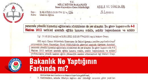 Milli Eğitim Bakanlığı valiliklere 24216 sayı ve 31.05.2012 tarihli, öğretmen dışındaki personele hizmetiçi eğitimin yürütülmesi kapsamında 4-8 Haziran 2012 tarihleri arasında eğitim kurumu müdür, müdür başyardımcısı ve müdür yardımcılarına yönelik uzaktan eğitim yöntemiyle seminer düzenlemesi için bir yazı göndermiştir.