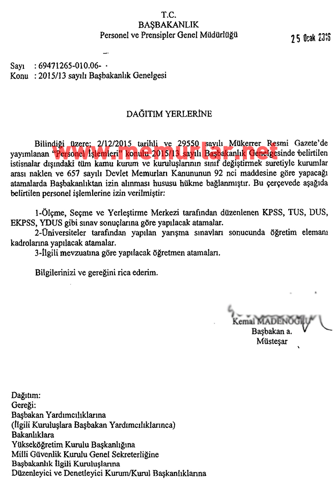 2015/3 sayılı Başbakanlığın atama Genelgesi 2 Aralık 2015 tarihli Resmi Gazetede yayımlanmıştı. Genelge daha sonra 10 Aralık tarihinde değiştirilmişti.