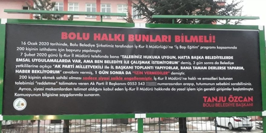CHP'li Bolu Belediye Başkanı Tanju Özcan'ın İŞKUR aracılığıyla belediyeye 200 kişi alma talebi, İŞKUR tarafından kabul edilmeyince Başkan Özcan, söz konusu iddialarını AK Parti İl Başkanı Doğanay'ın telefon numarasının da yer aldığı bir afiş hazırlatarak