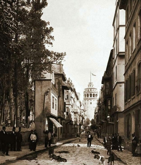 Galata Kulesi (1850'li yıllar) Kulenin külah kısmı 1860'lı yıllar sonrası kaldırılmış. 1960'larda tekrar konulmuş.