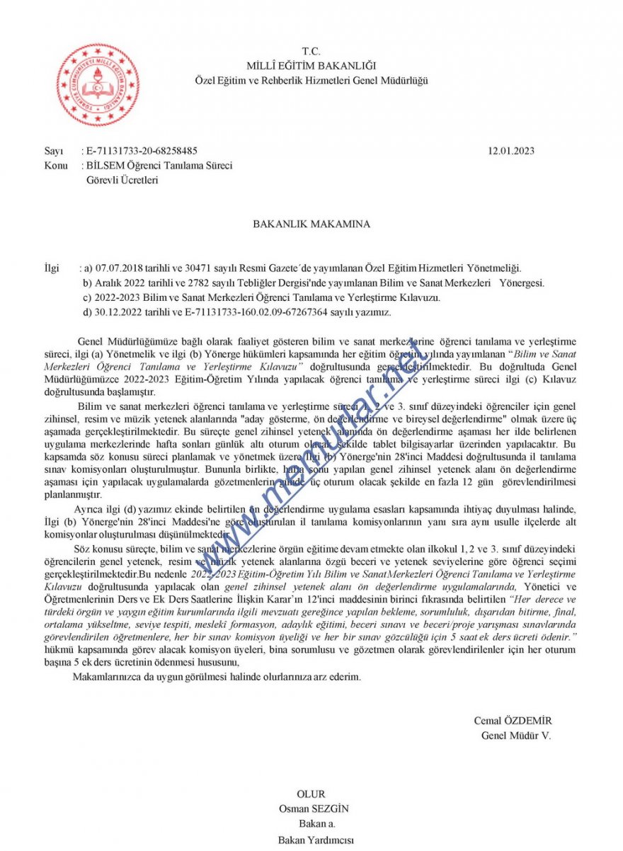 Milli Eğitim Bakanlığı Özel Eğitim ve Rehberlik Hizmetleri Genel Müdürlüğü 12.01.2023 tarih ve 68258485 sayılı yazısıyla BİLSEM Öğrenci Tanılama Süreci Görevli Ücretleri hakkında açıklama yaptı.