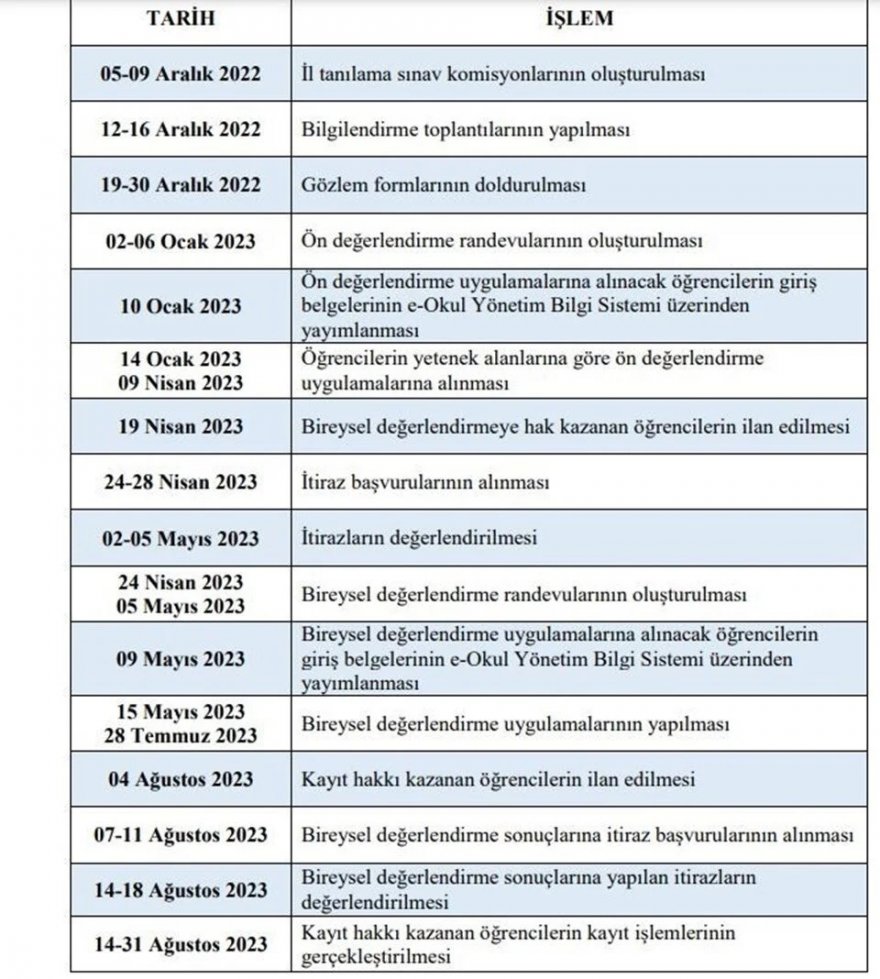 Öğrencilerin yetenek alanlarına göre ön değerlendirme uygulamalarına alınması 14 Ocak 2023- 09 Nisan 2023 tarihlerinde tamamlanacak. Bireysel değerlendirmeye hak kazanan öğrenciler ise 19 Nisan 2023 tarihinde ilan edilecek.