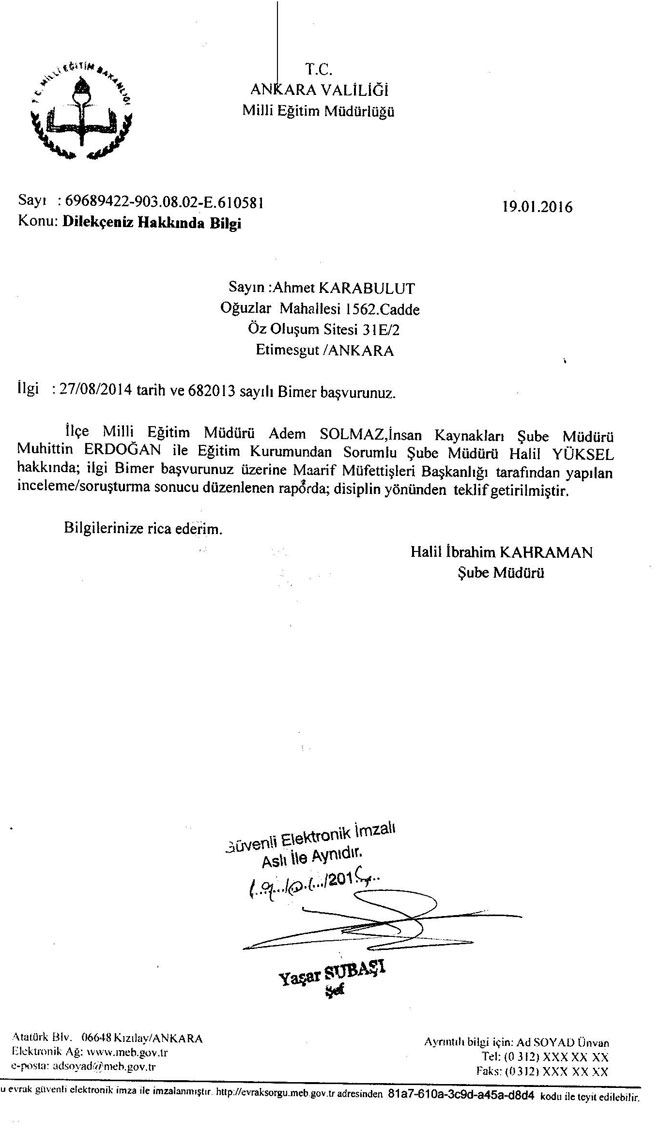 Maarif Müfettişleri Başkanlığı tarafından yapılan inceleme/soruşturma sonucu, Sincan İlçe Milli Eğitim Müdürü Adem SOLMAZ, İnsan Kaynakları Şube Müdürü Muhittin ERDOĞAN ile Eğitim Kurumundan Sorumlu Şube Müdürü Halil YÜKSEL hakkında, disiplin yönünden teklif getirildiği belirtilmiştir.