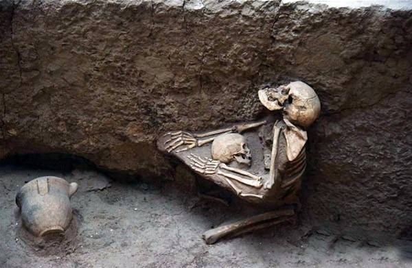 Çin’in Pompeii’si olarak bilinen Lajia yerleşim yerinde MÖ 2000’e ait bir deprem sırasında birbirine sarılmış halde ölen anne ve çocuk iskeletleri görenleri şaşırtıyor.