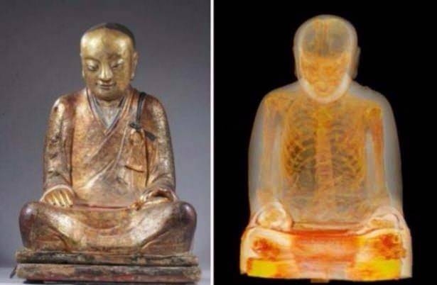Ancak yapılan incelemede Buda heykelinin içinde, Budist bir rahibe ait olduğu tahmin edilen mumyalanmış bir beden çıktı.