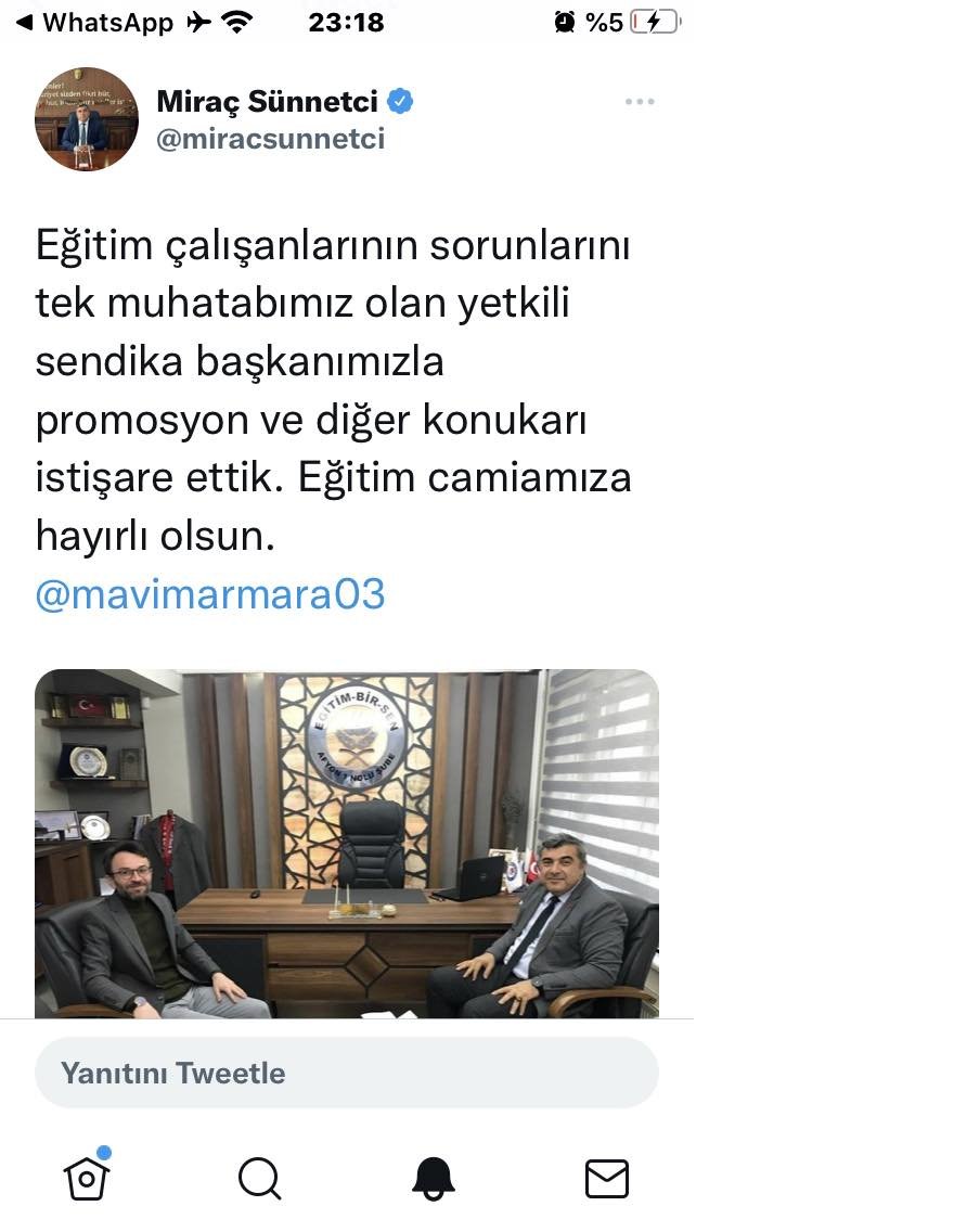 "Eğitim çalışanlarının sorunlarını tek muhatabımız olan yetkili sendika başkanımızla promosyon ve diğer konuları istişare ettik. Eğitim camiamıza hayırlı olsun. @mavimarmara03"