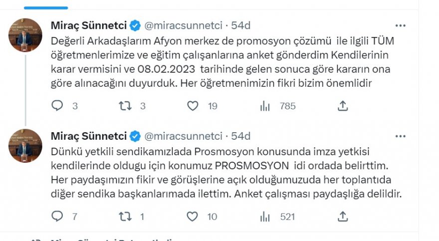 Müdür Miraç Sünnetçi, 3 Şubat 2023 tarihinde sosyal medya hesabından yapmış olduğu paylaşımda; Eğitim-Bir-Sen Afyonkarahisar 1 No'lu Şube Başkanı Mustafa Arslan'la birlikte olduğu fotoğrafla şu paylaşımda bulundu: