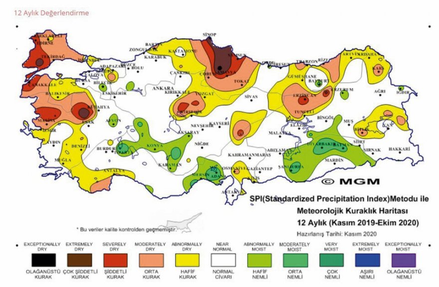 Türkiye'de yağışsız geçen aylar ve özellikle son dönemlerde baraj göllerinden yansıyan korkutucu fotoğraflar kuraklık konusunu gündemin üst sıralarına taşıdı. Meteoroloji Genel Müdürlüğü tarafından hazırlanan Ağustos-Ekim 2020 dönemine ilişkin meteorolojik kuraklık haritalarında yaşanan sıkıntının boyutu net bir şekilde fark edilebiliyor. Uzun yıllar kasım ayı yağış ortalaması 67,8 milimetre olan Türkiye'de, geçen ayki yakış miktarı 34,7 milimetrede kaldı.