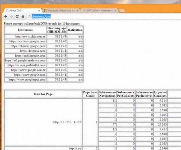 DNS kayıtlarını görün chrome://dns/ komutunu kullanarak ön-bellekteki DNS kayıtlarını görebilirsiniz.