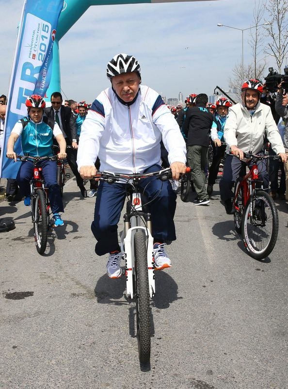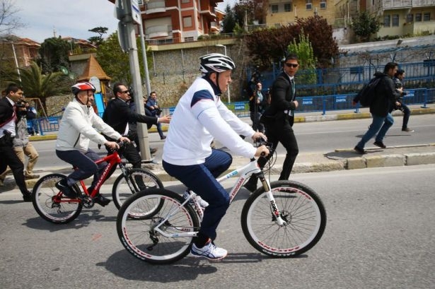 Cumhurbaşkanı Erdoğan için özel olarak hazırlanan ve isminin yazdığı bisiklete binerek pedal çevirmeye başladı. Erdoğan'a bürokratlar da eşlik ederken, korumalar da yanında koştu.