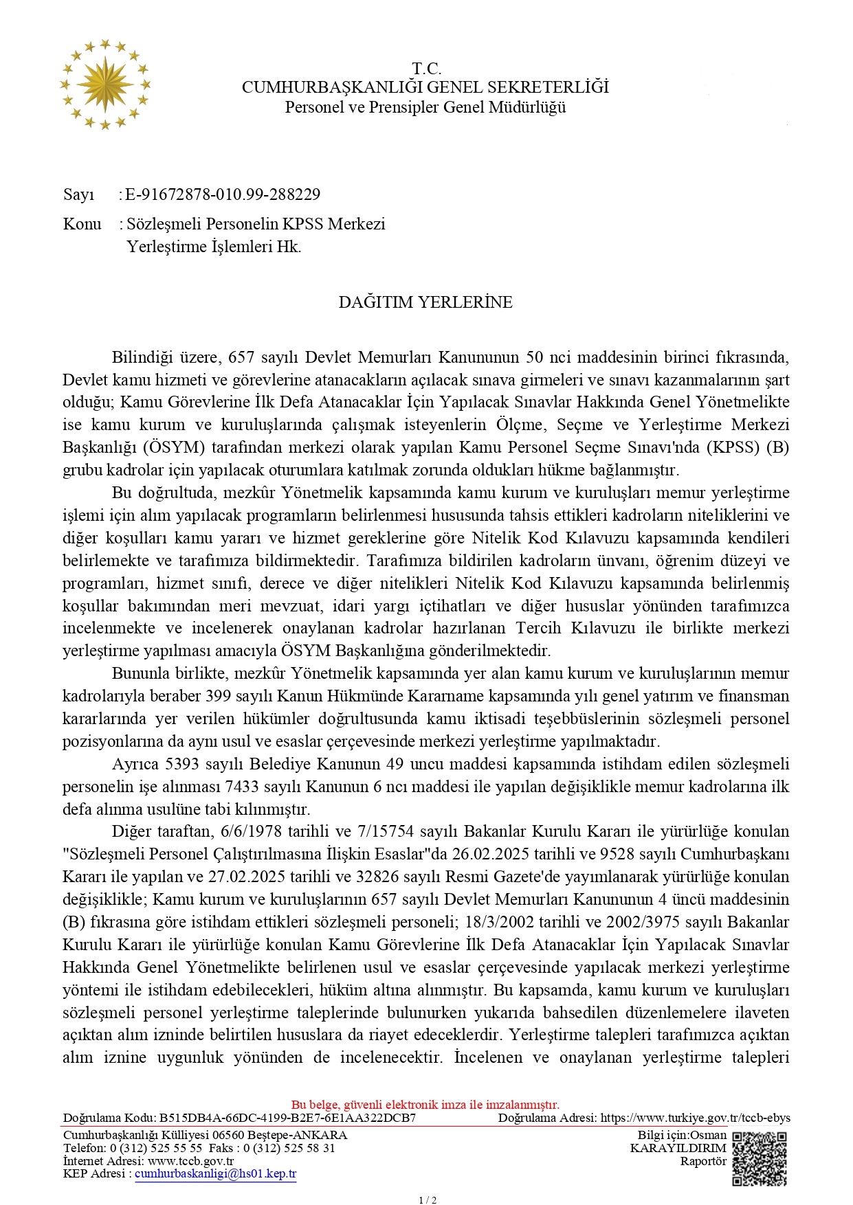 Bu çerçevede, Cumhurbaşkanlığı Personel ve Prensipler Genel Müdürlüğü tarafından tüm kamu idarelerine gönderilen yazıda; sözleşmeli personel alımlarının memur kadrolarında olduğu gibi belirlenen takvime göre yerleştirme talebinde bulunulabileceği ifade edildi.