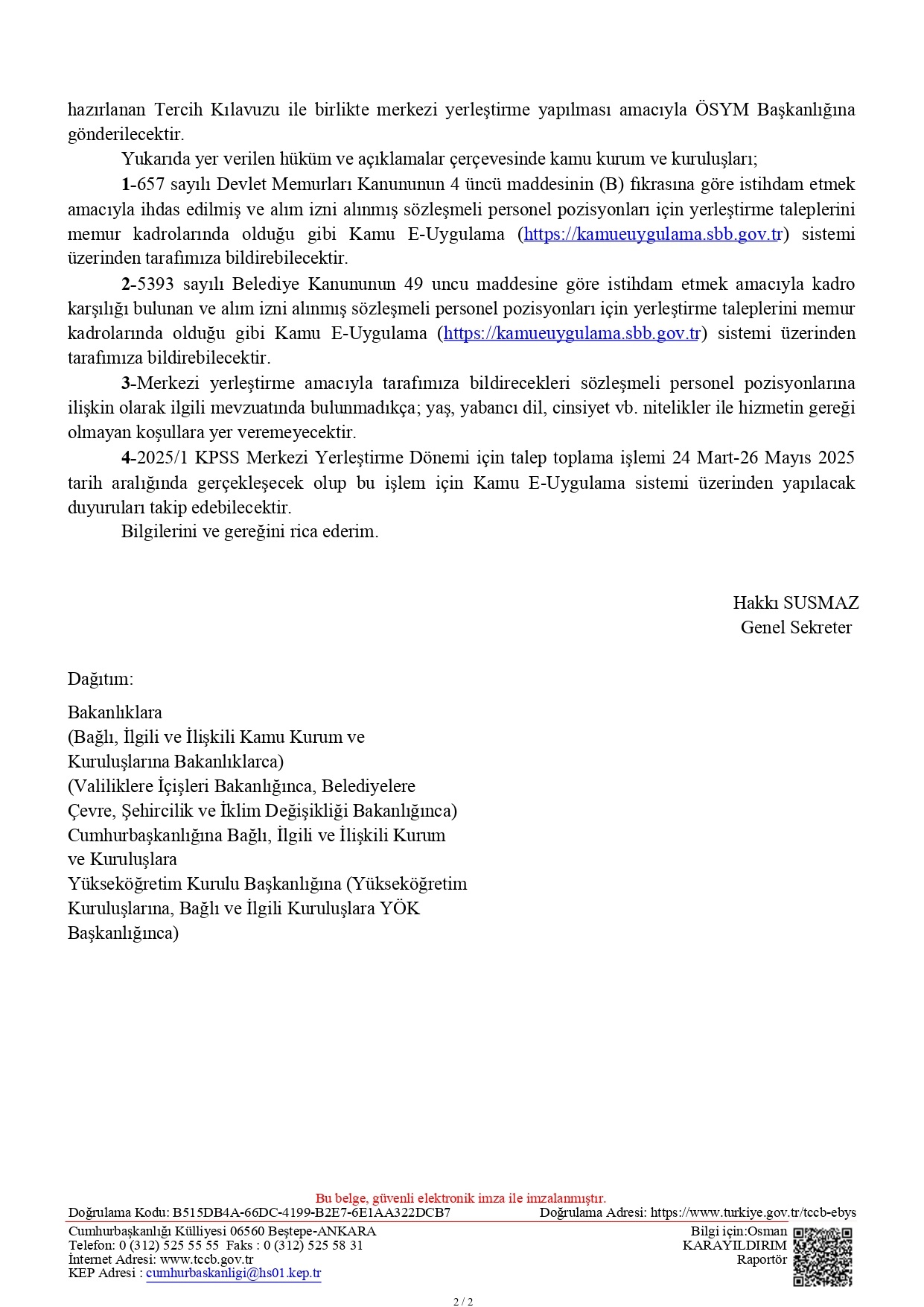 Buna göre, kamu idareleri merkezi yerleştirme için sözleşmeli personel alım taleplerini 24 Mart-26 Mayıs 2025 tarihlerinde Cumhurbaşkanlığına bildirilebilecektir.